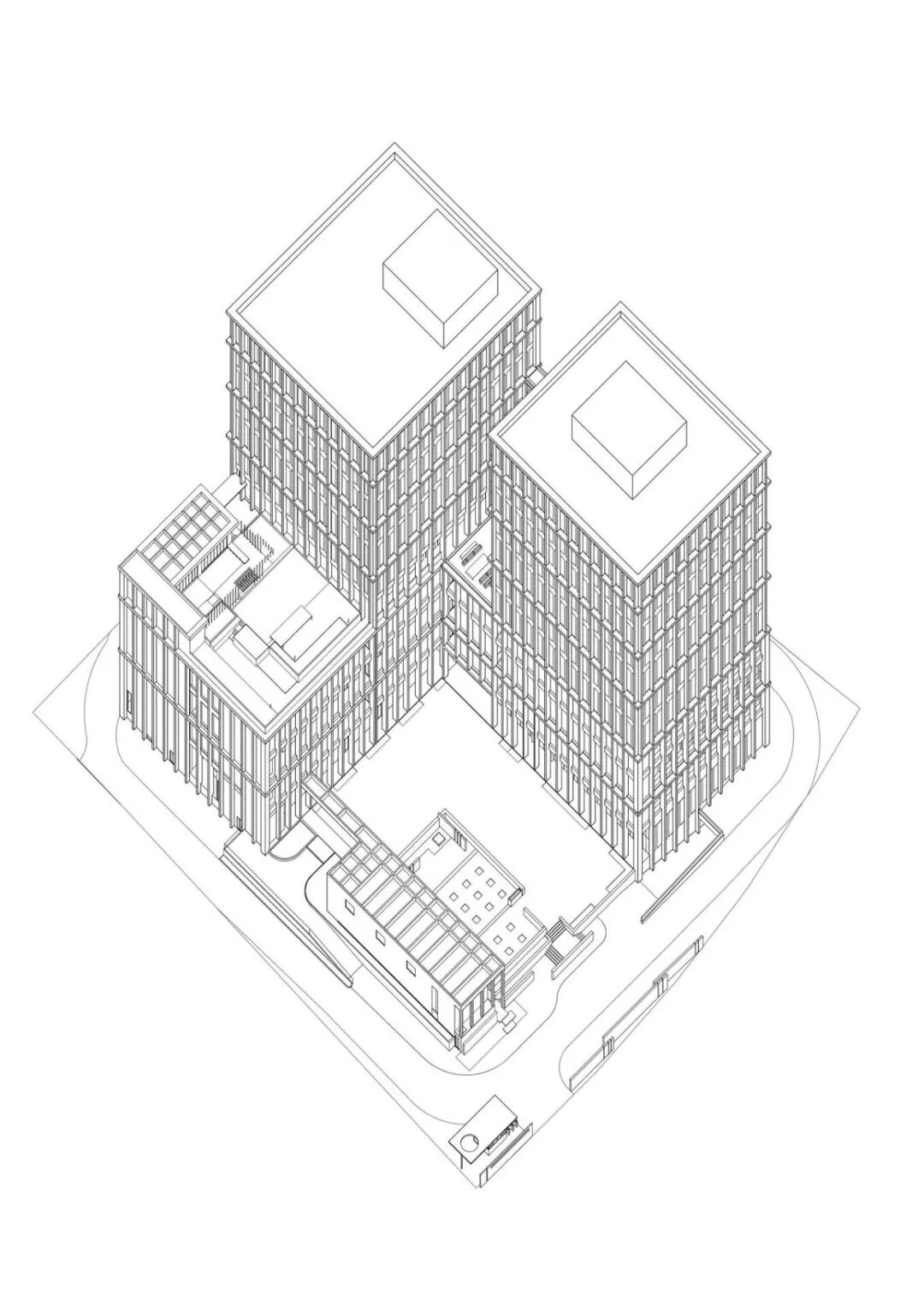 同时我们增加了一个独立的展厅体量,与其他单体一同形成U字形布局,呼应与致敬老园区的半围合布局。