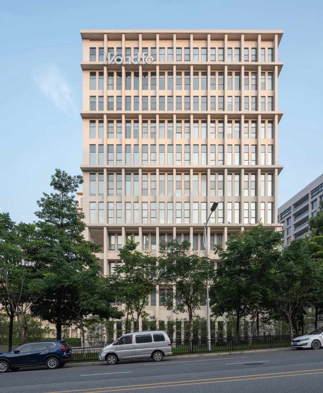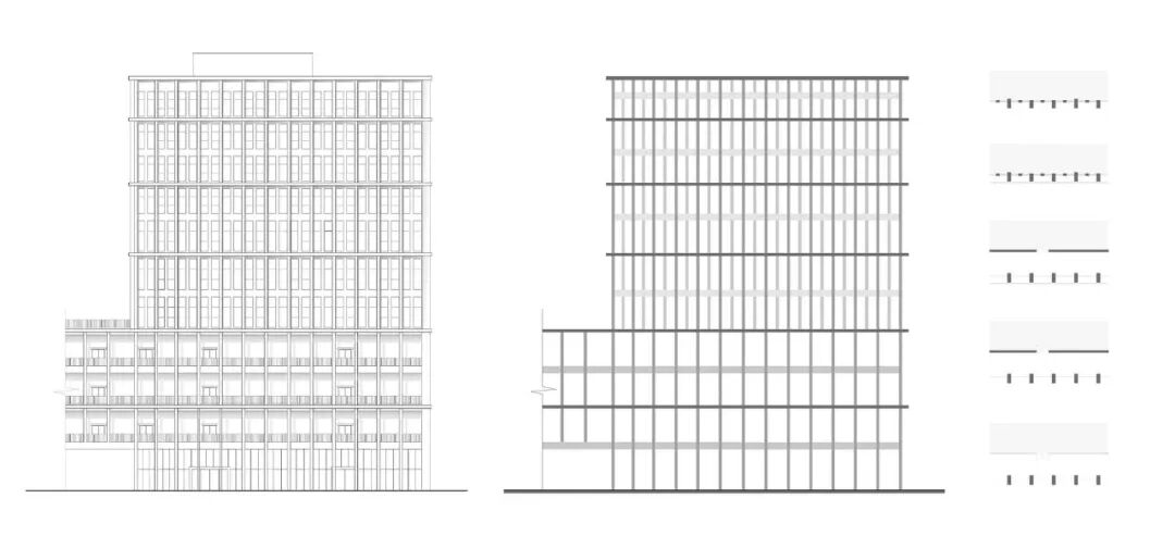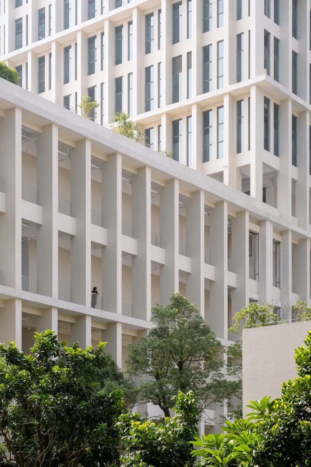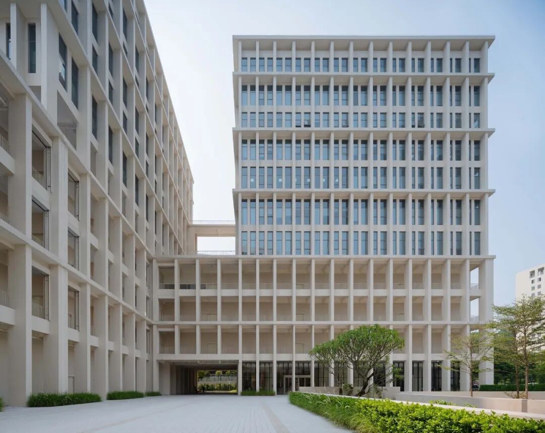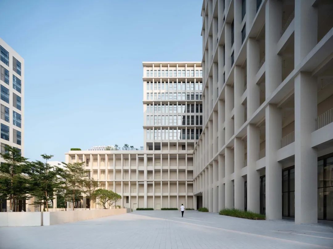 建筑外立面设计起源于广州的骑楼,我们通过一系列风雨廊把各个建筑单体链接,形成外廊式建筑。我们希望立面在阴影的塑造的同时,又能够通风和调节建筑的微气候。建筑体量通过线性挑板强调修饰出首层连廊、裙楼和塔楼,视觉上使得各个建筑单体联系成为统一的整体。立面砖的颜色采用定制的哑光米白色,在不同的光照环境下颜色会产生微弱变化。