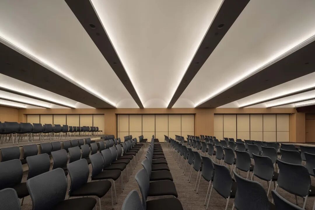 大堂布局因动线切分为东西双厅。裙楼顶层设置了阶梯多功能厅,抽掉多余结构柱,实现18.5米大跨度空间,最大实现台上台下互动。