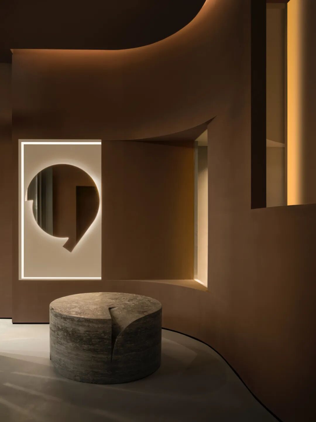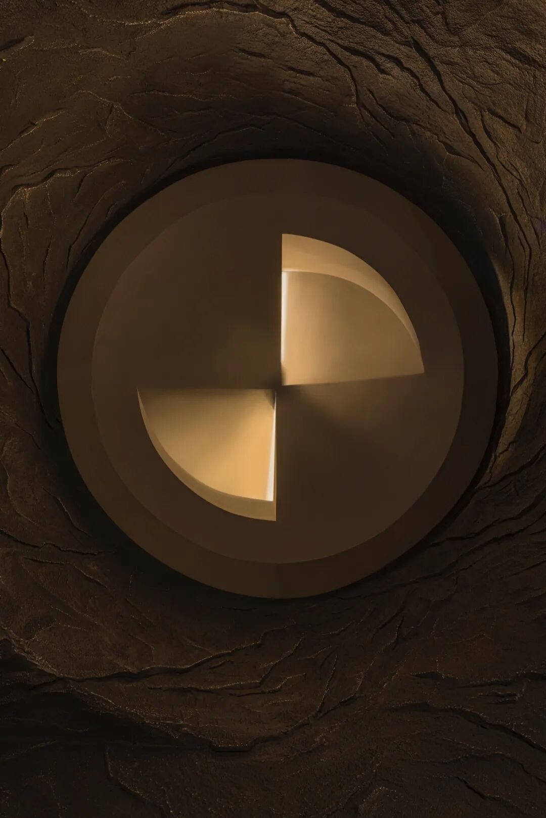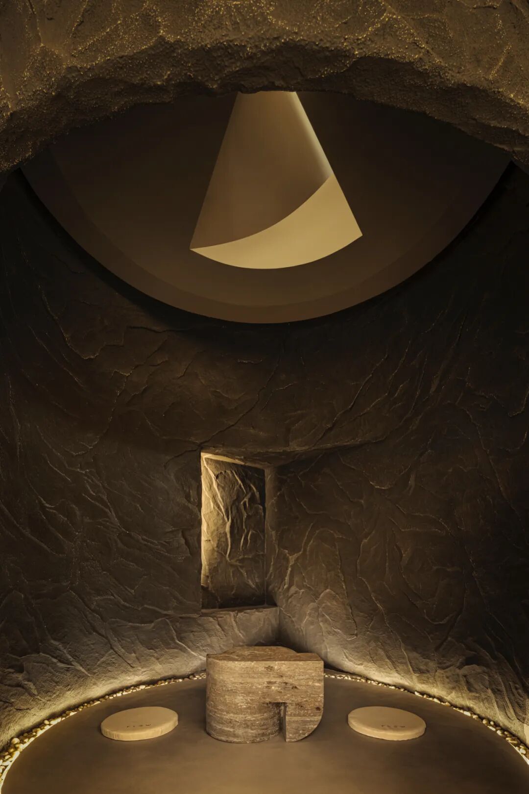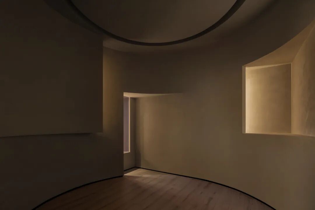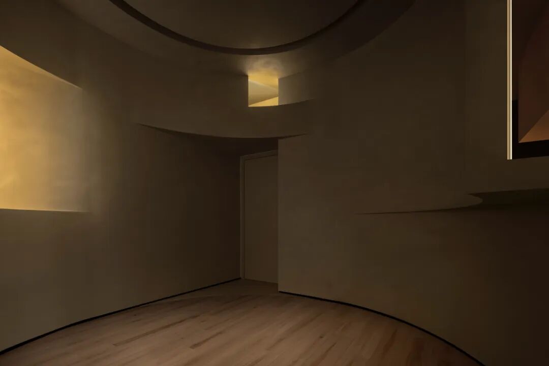 空间设计运用贴近⼤地的⾊调及质朴的光影,营造出安稳平静的氛围,而曲面的运用提供一种圆润的包裹感,同时助使声音在空间中均匀传播,整体设计意图打造一个宁静、思考以及探索内在的、专为冥想体验服务的空间环境。