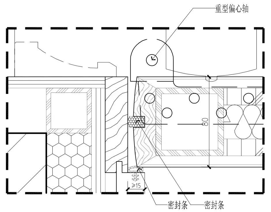 常规平开门中间会留2mm留缝,而超高超重门需要5~10mm留缝,而为了减少这种留缝情况,一般会在门扇中设置挡尘条或密封胶条进行封堵处理,也可将门扇做错缝处理。