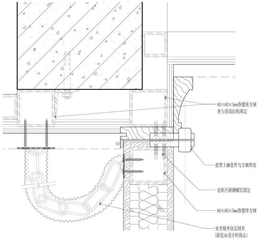为了保证其安全性,当门超过6m时,应由结构设计核算是否需要增加安全链,若需增加,在深化时就应预留安全链的埋件,埋件需与基层钢架连接,切不可固定于门套饰面上。
