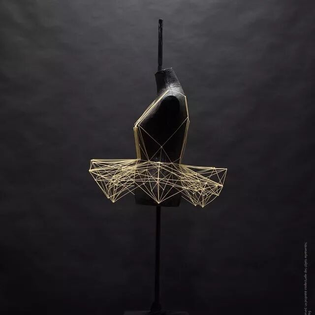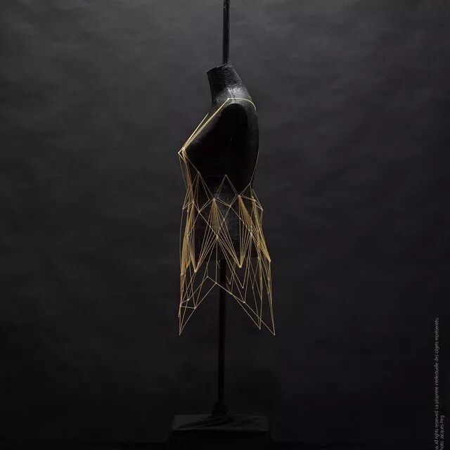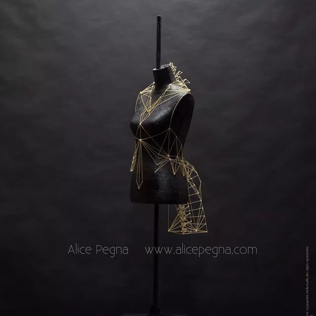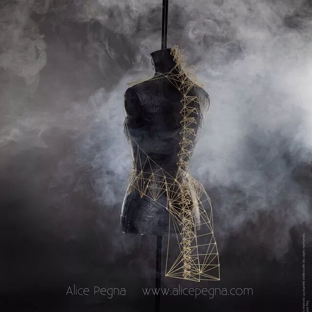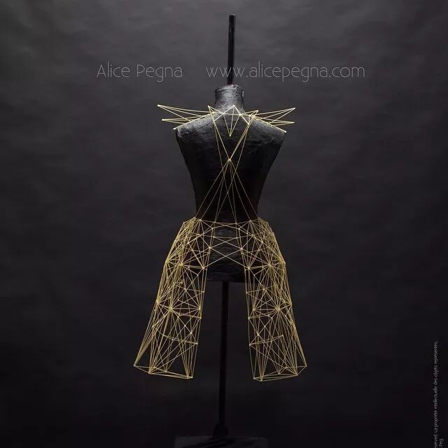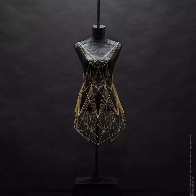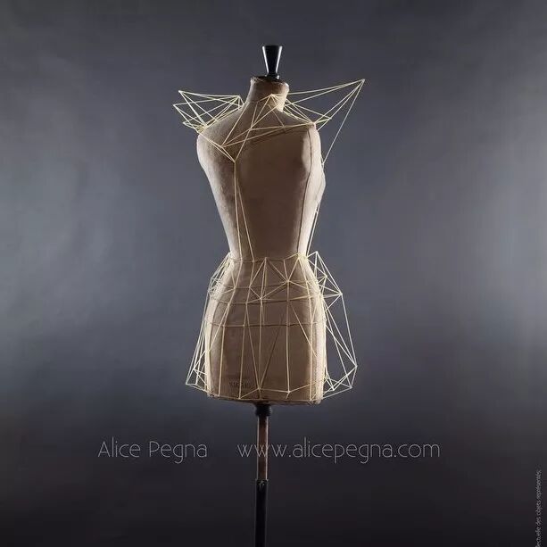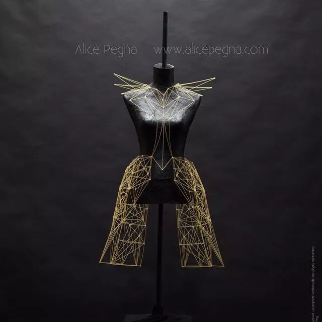 例如,意大利面条通常作为烹饪原材料,其干练的流线造型、精致而又具有一定的柔韧性,同时又保持坚硬并于易断裂的特点。因而她尝试选择意大利面来设计时装造型