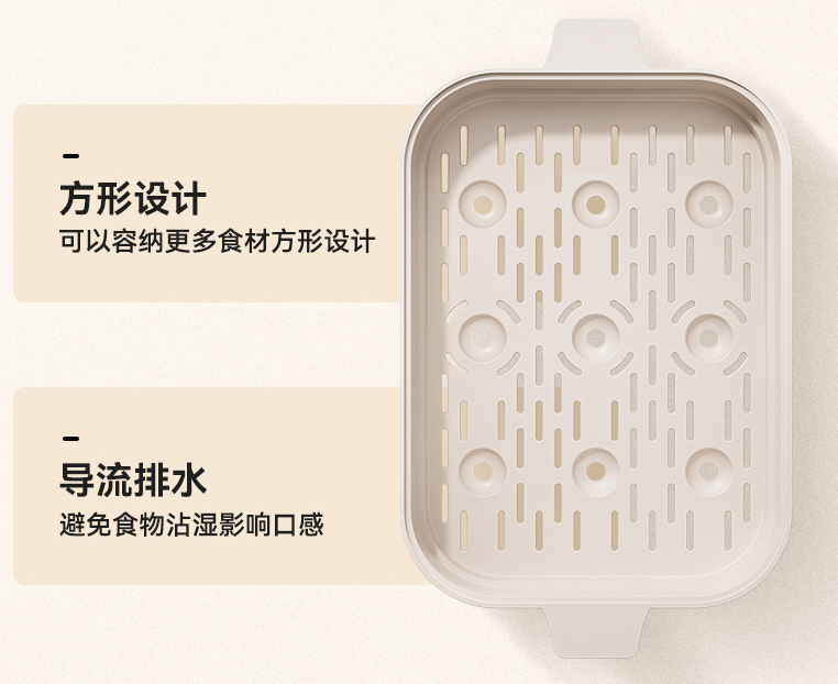 蒸笼采用食品级PP材质打造,蒸煮耐用无异味、不变形。