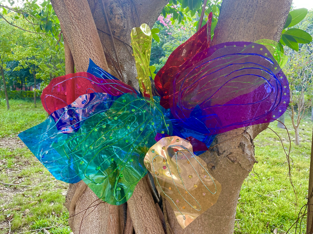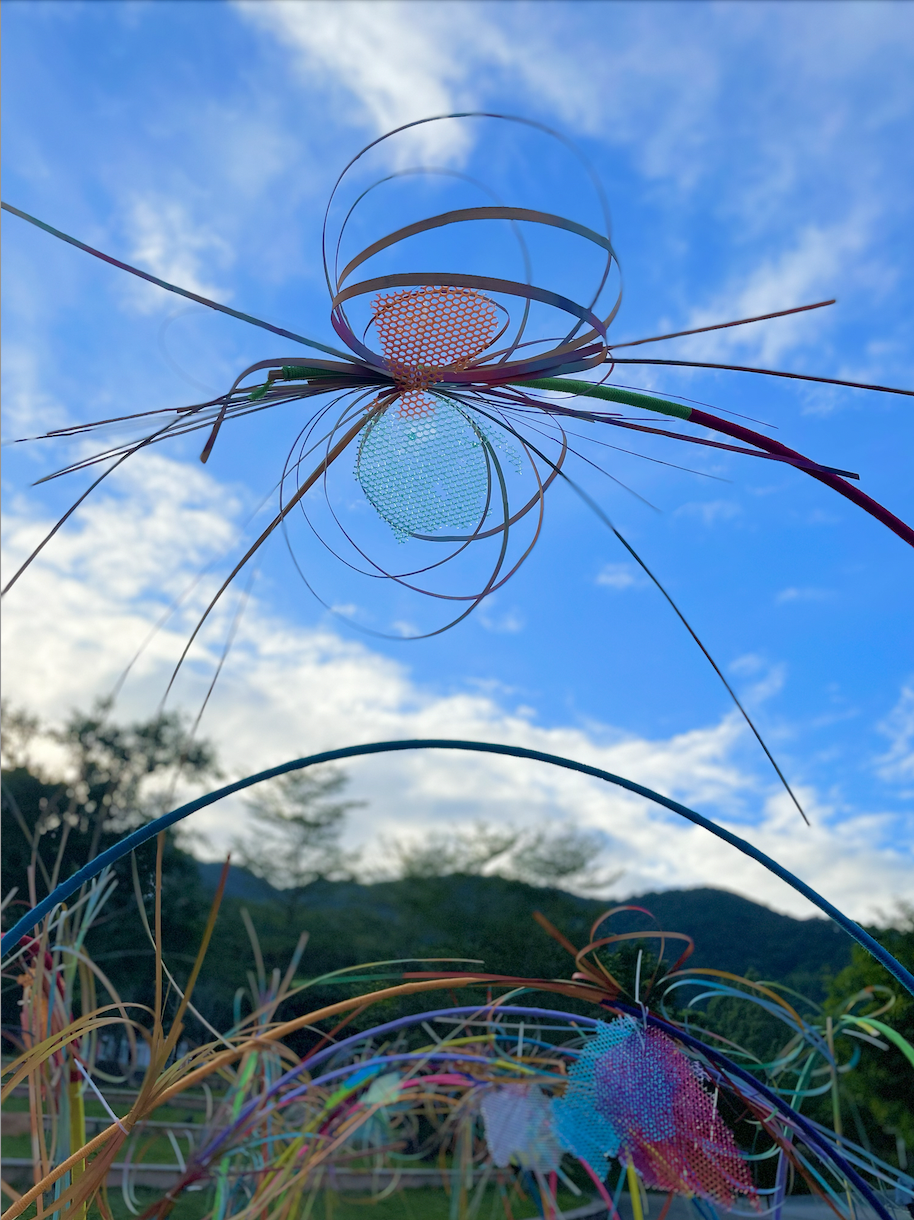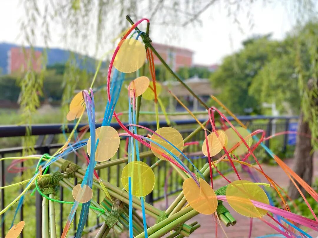 “正怜火树千春妍,忽见清辉映夜阑”,漫天姹紫嫣红的烟火像春天盛放的花朵,给新一年打开崭新的篇章。轻盈幻彩的竹篾犹如烟花冲上云霄在空中留下的闪亮光芒,而不规则的镂空彩片则是运用风筝的姿态展现出废弃材料再创作的魅力。风筝和烟火划过天空,共同拥抱美好。
