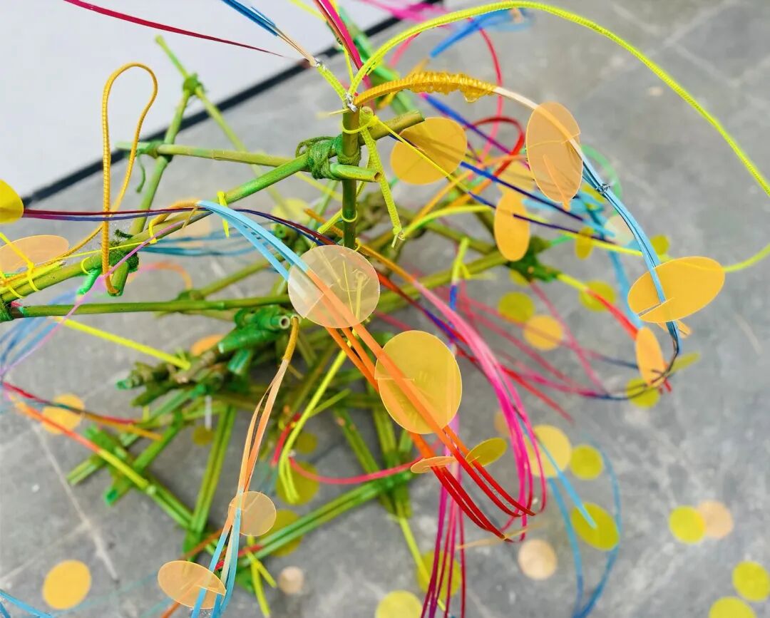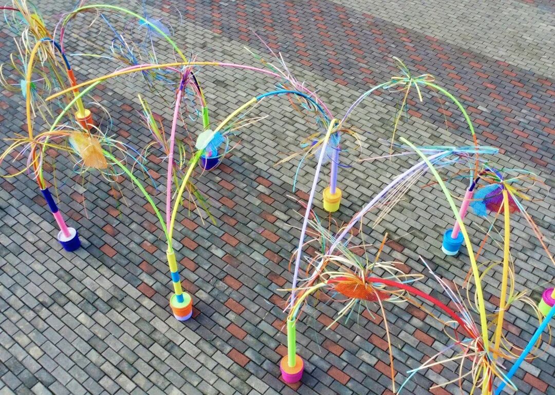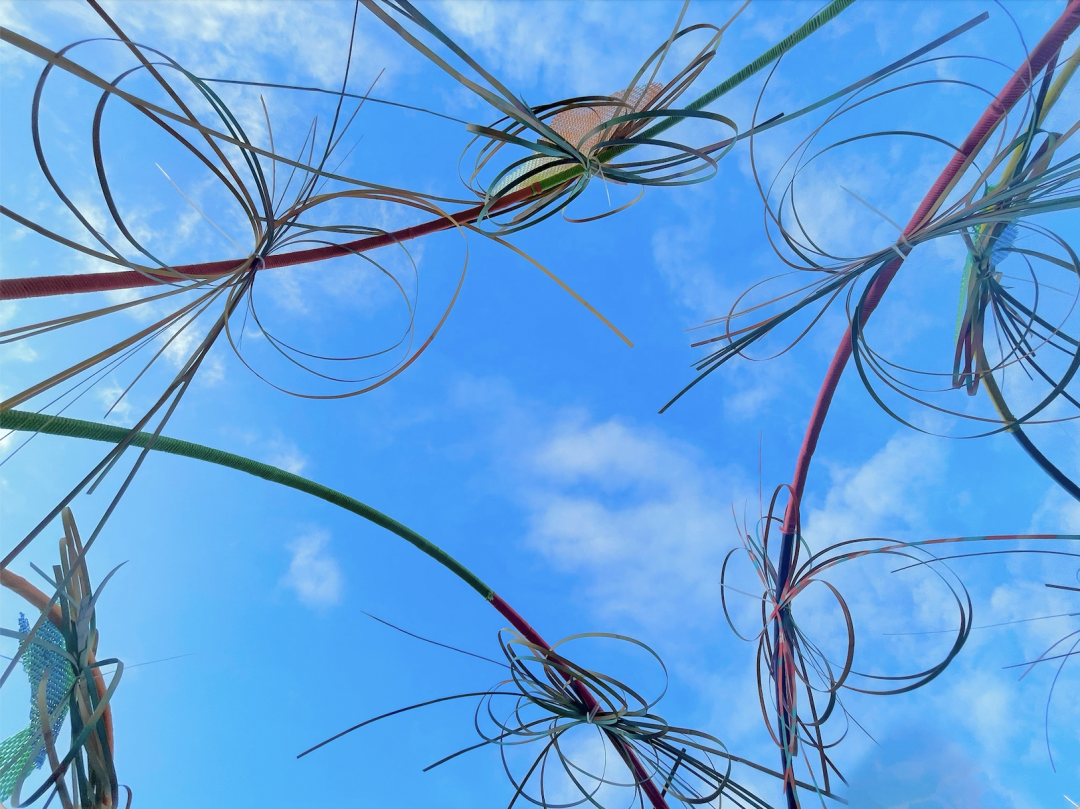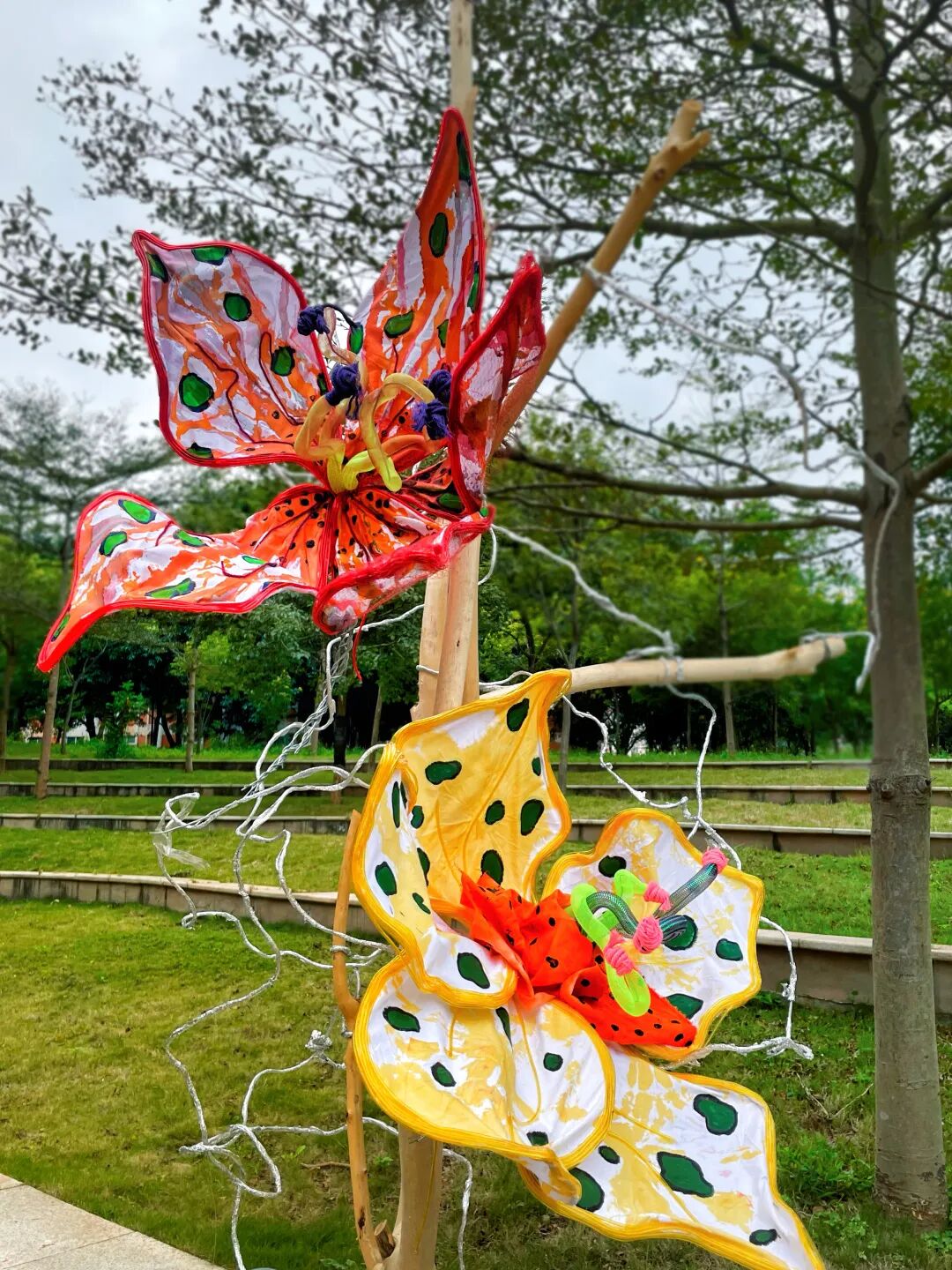 “正怜火树千春妍,忽见清辉映夜阑”,漫天姹紫嫣红的烟火像春天盛放的花朵,给新一年打开崭新的篇章。轻盈幻彩的竹篾犹如烟花冲上云霄在空中留下的闪亮光芒,而不规则的镂空彩片则是运用风筝的姿态展现出废弃材料再创作的魅力。风筝和烟火划过天空,共同拥抱美好。
