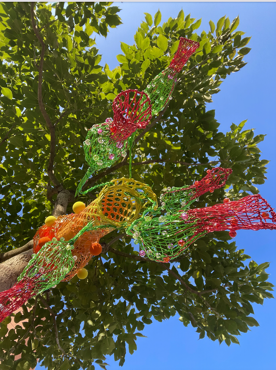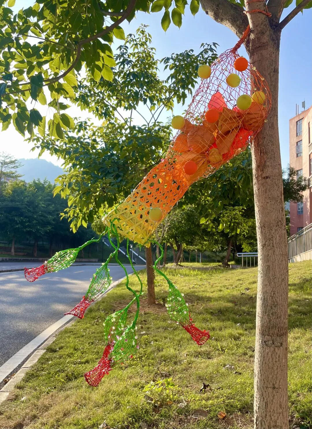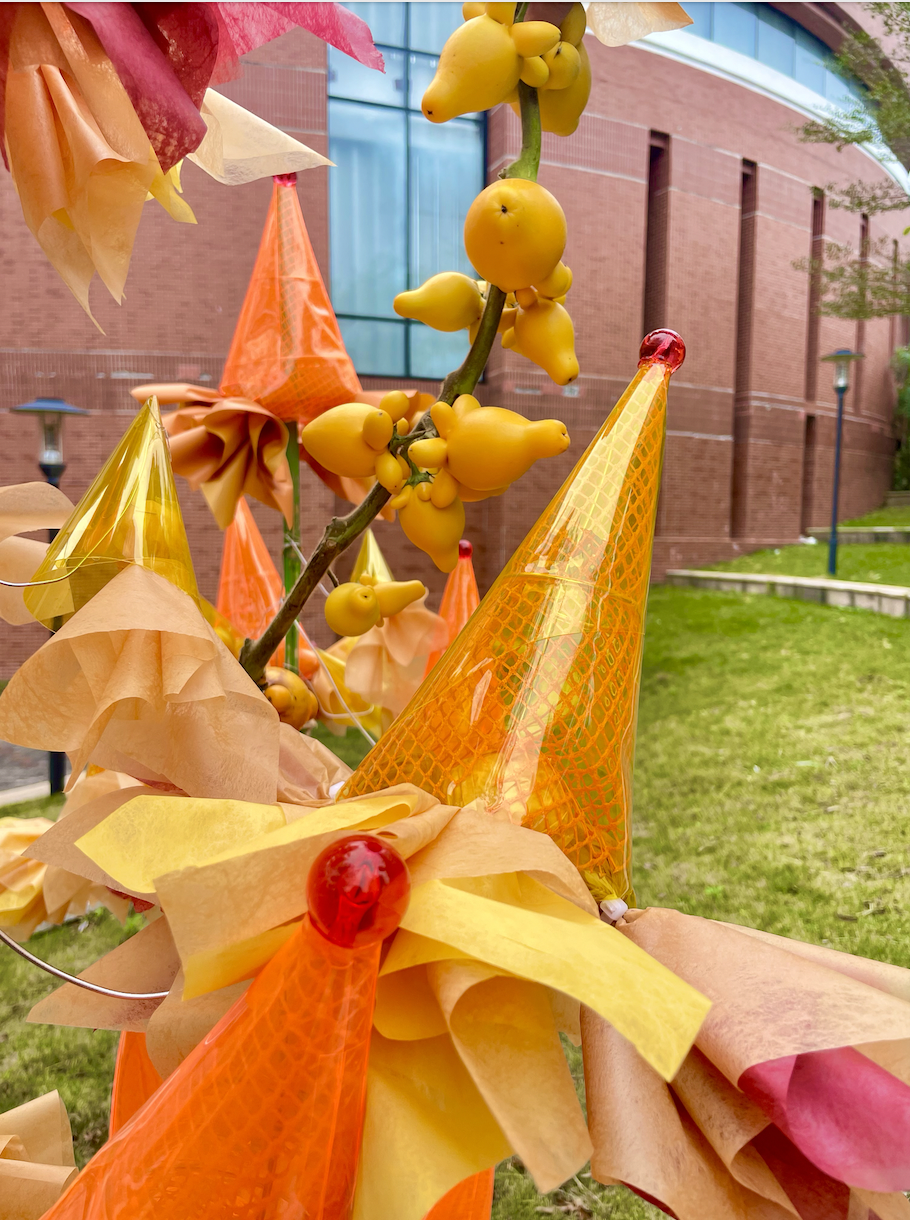 黄金果因其独特的外形又称作“五代同堂”,作品采用层层叠加的构成方式,呈现金玉满堂的喜庆氛围。以不同透明度的橙红调面料打造出金鱼游动的造型,以盘旋上升的动线抵达顶点,好一番“年年有鱼”,“节节高升”的美好景象。