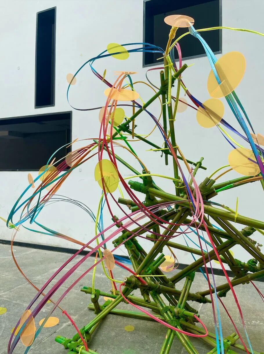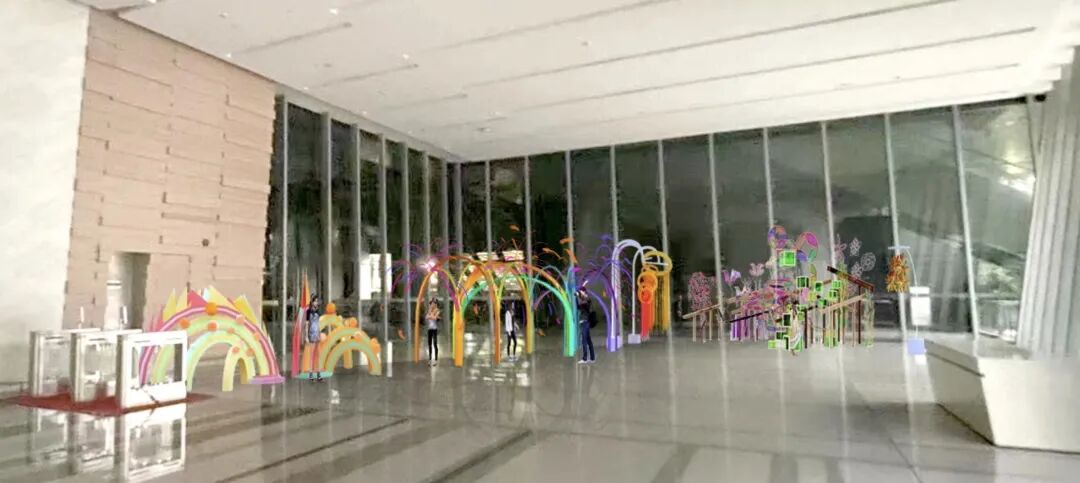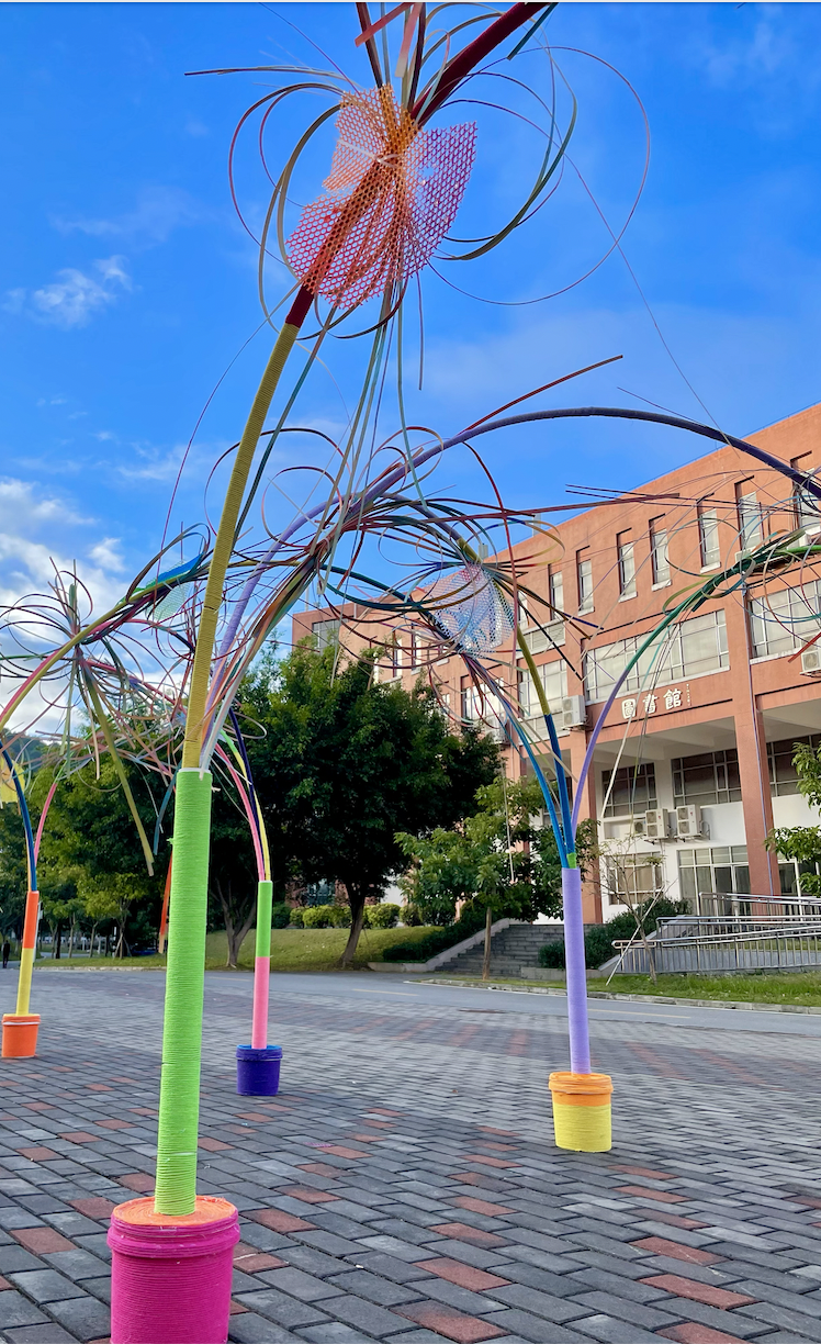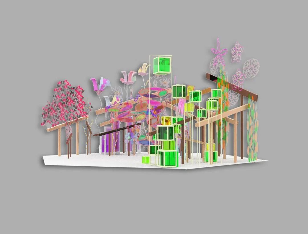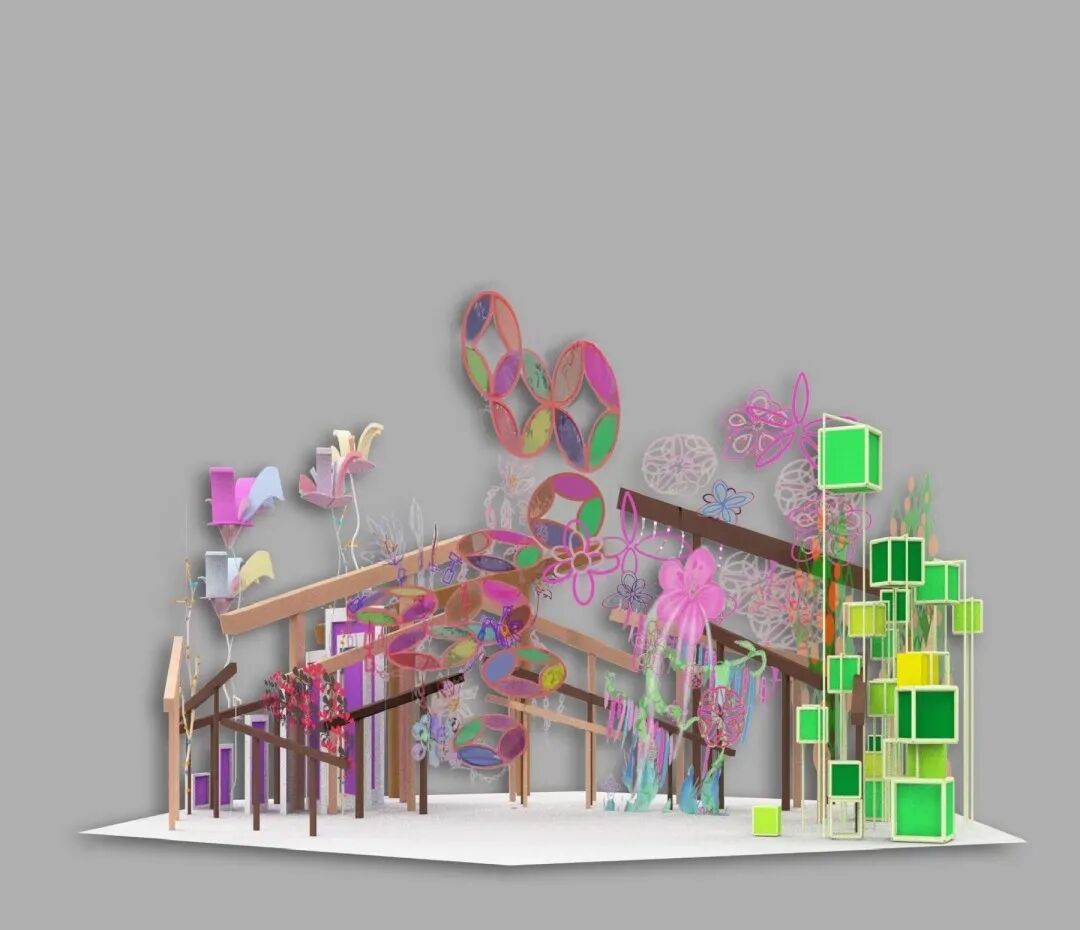 作品灵感来自广州传统花市中阶梯状的竹棚摊位,各种吉祥寓意的迎春花整齐排列,高低有致。在这个作品中策展人担任主结构设计师,以节节高升的木结构与倾斜半透明管道组合而成,使整体框架连成一幅百花长卷。并带领多位学生担任“摊主”,在各自的位置中创作出迎春的系列作品,百花齐放,张灯结彩,好一番喜庆祥和的景象。