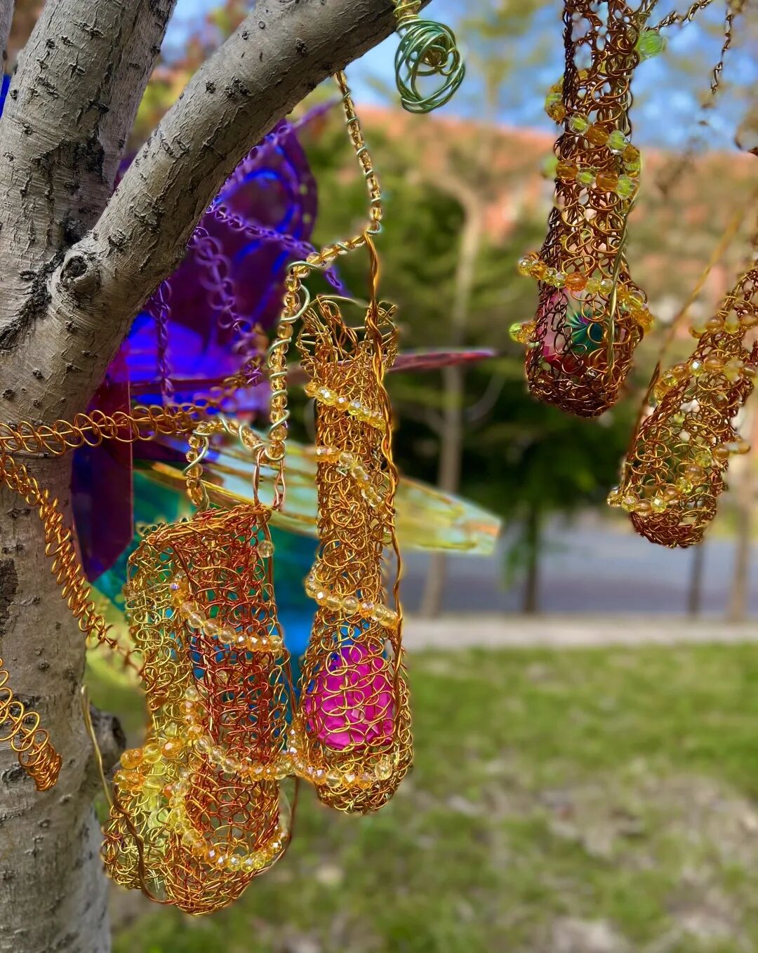 猪笼草的学名是“Nepenthe”,其意思为“没有悲伤”,在希腊神话中,“Nepenthe”是一种可以让人遗忘所有悲伤的药物,用金属丝编织的猪笼草希望以其晶莹夺目的姿态让大家在新一年中忘却烦恼,迎接新的希望。如福袋般的捕虫笼不断吸取营养,展现出生机勃发的一面,犹如笼中的彩球不断累积着幸福。