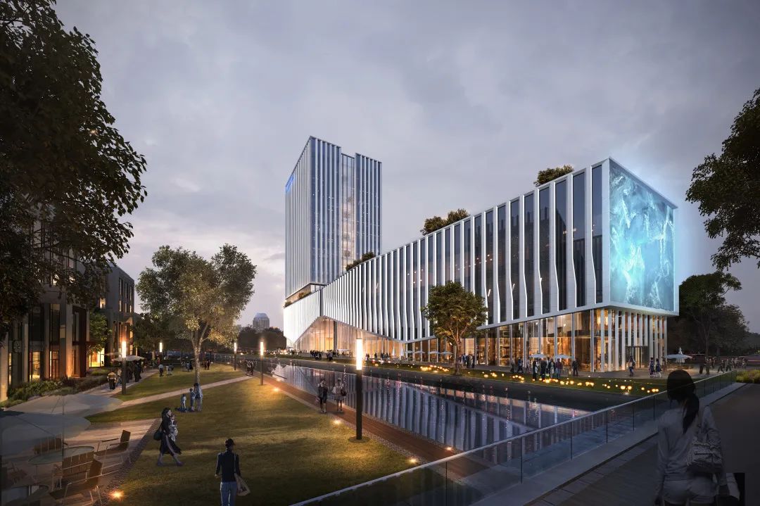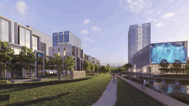 园区西侧地块,以一个“超级智慧环”聚焦相关产业服务区,包含技术研发中心、人才培育中心、上市公司孵化中心,以及国际化运营平台,彼此之间通过空中连廊相互连接。并根据不同企业诉求,开发多种办公产品,打造适应性办公空间。我们希望通过园区内产业集聚与强关联,实现协同共赢,提升园区的效率与可持续发展。