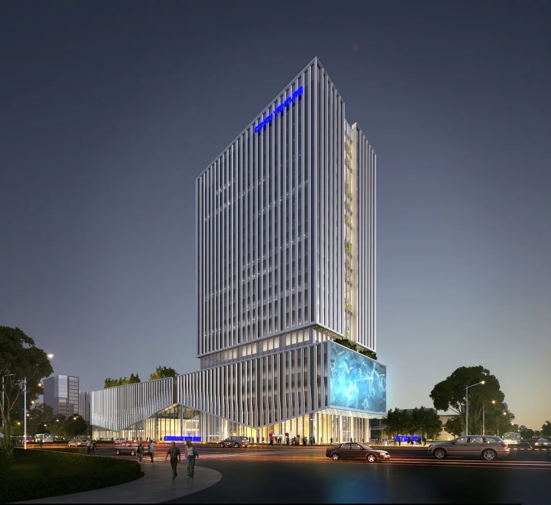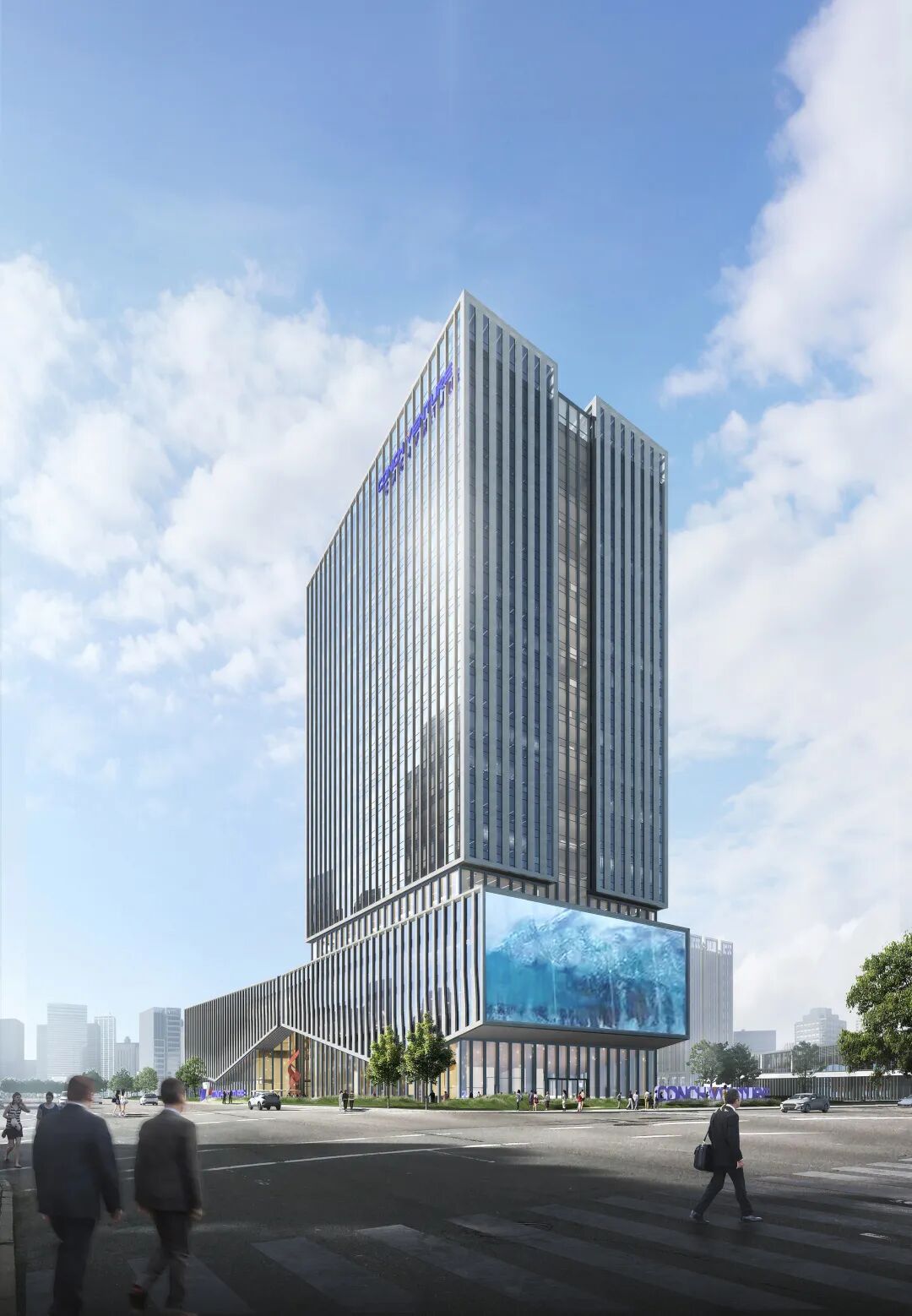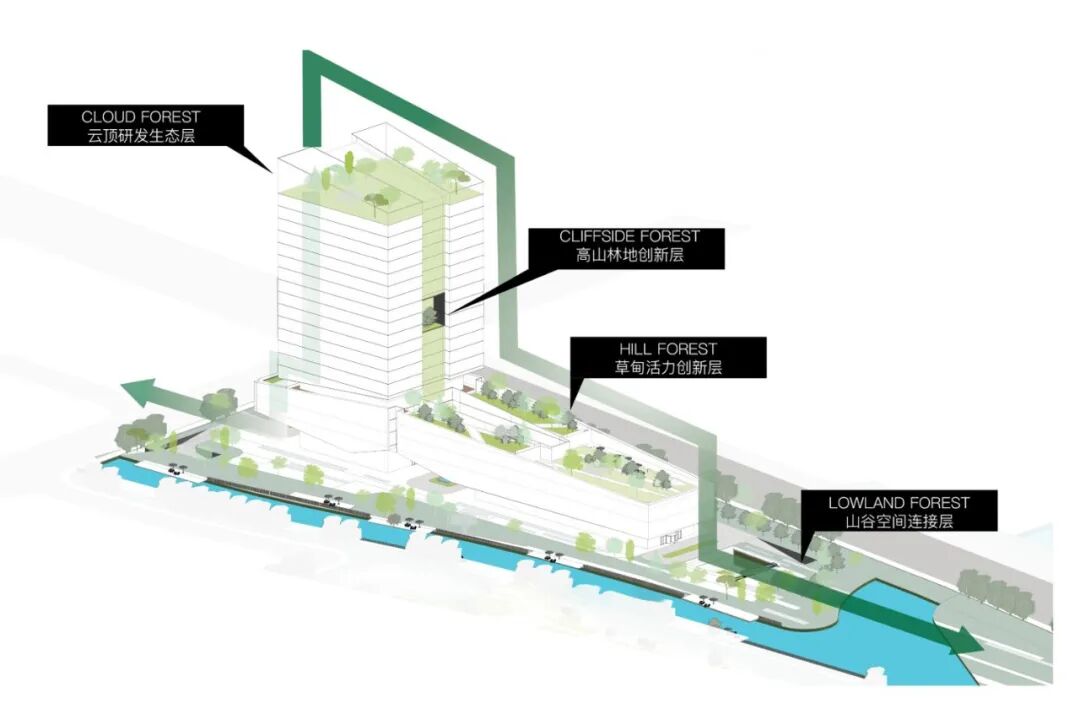 总部大楼在纵横两个维度上,以方正的大平层保证其使用效率与空间品质。在建筑内部,形成垂直生态功能社区,通过垂直交通连接各个功能空间,增加研发的协同性与非正式交流场所。