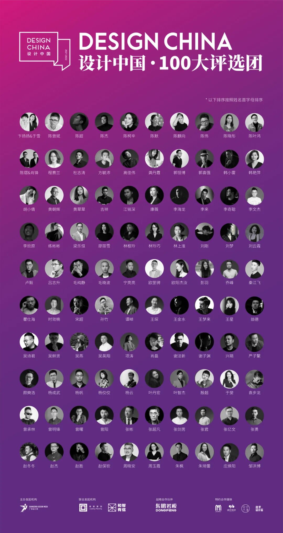 每一年设计中国都会特邀百位专业观众检验自己的策展成果,我们称这些特别的观众为:设计中国100大评选团,他们多为细节控,拥有“毒辣”的眼光,其中不乏设计师、生活美学家、文化评论人、资深媒体人、品牌主理人等,他们会在广州设计周期间考察设计中国各主题展位并出席年度总竞演,聆听参赛城市策展人对于地域文化的独特表达。现场参与设计中国年度总竞演投票,与嘉宾评选团合力评选出设计中国年度策展大奖(团体类)。