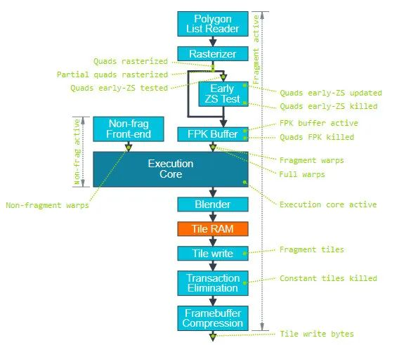 Transaction Elimination 也是一种很有效的降低带宽的方法。在有些情况下,只有部分 Tile 中的内容会变化(例如摄像机不动,一个 Tile 中只有静态物体)。此时通过比较该 Tile 前一次和本次的渲染结果的 CRC 值,可得到 Tile 是否变化,如果不变,那么就没有必要执行 Tile 到 System Memory 的写回操作了,有效地降低了带宽占用。
