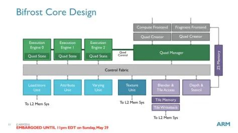 Bifrost 的执行核心不再是 Tripipe 结构。Bifrost 把 TextureUnit 和 L/S Unit 从 Execute Engine 中拆分开了。变成 Shader core 中的独立单元。这样可以避免负载不均衡导致 TU 的能力被浪费,同时也更容易扩展 ALU,增强 GPU 的计算能力。