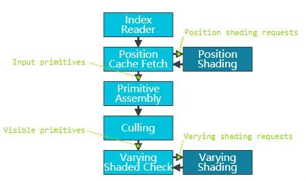 Vertex shading 被拆成两个部分,Position Shading 和 Varying Shading。计算完 position shading 就可以进行裁剪,只有通过裁剪的图元才会执行 varying shading。这样就被裁掉的图元就不用 fetch 各种属性甚至纹理了。