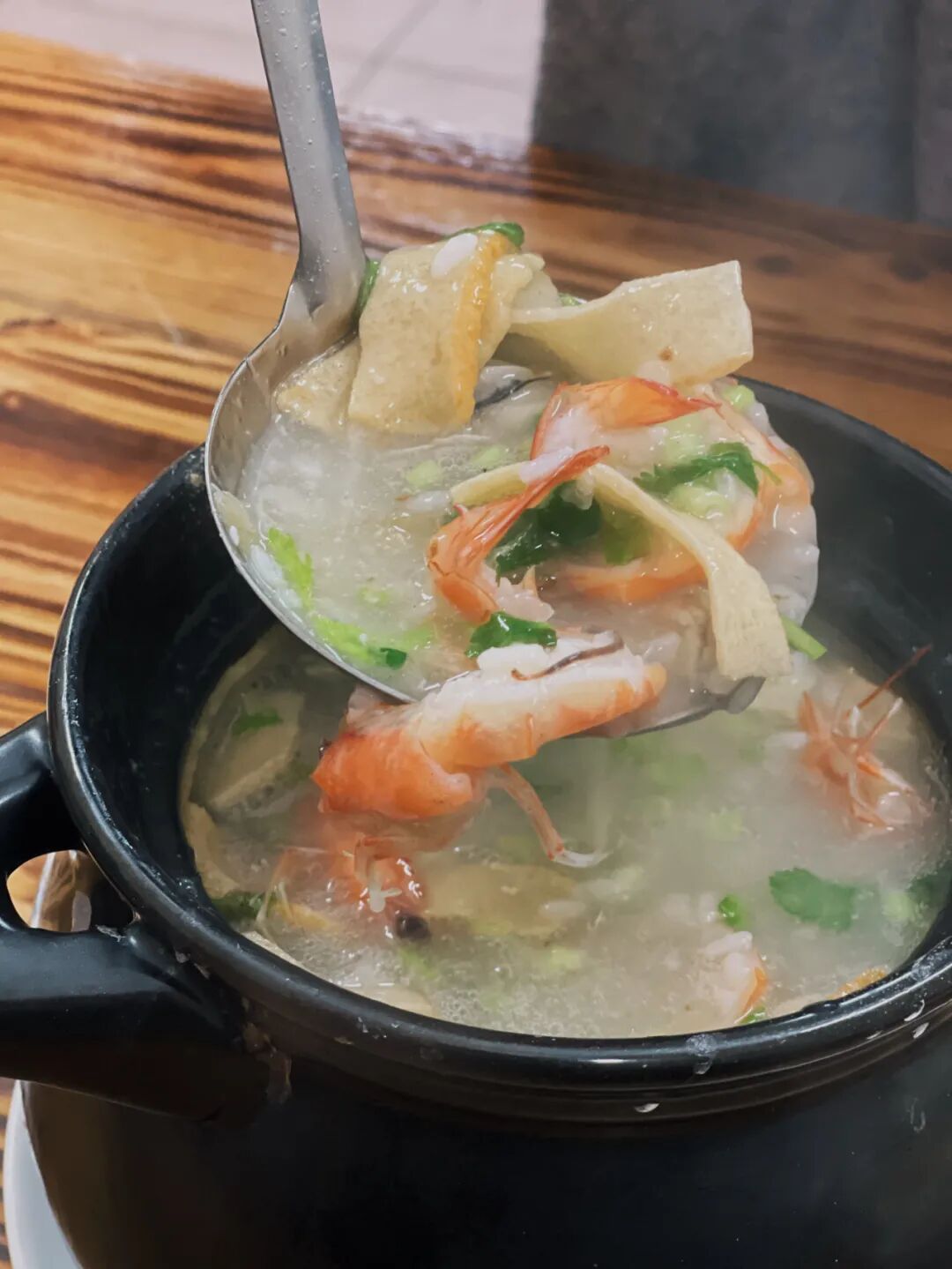 砂锅里熬煮的海鲜粥,粘软柔腻,搭配一碟清炒空心菜。