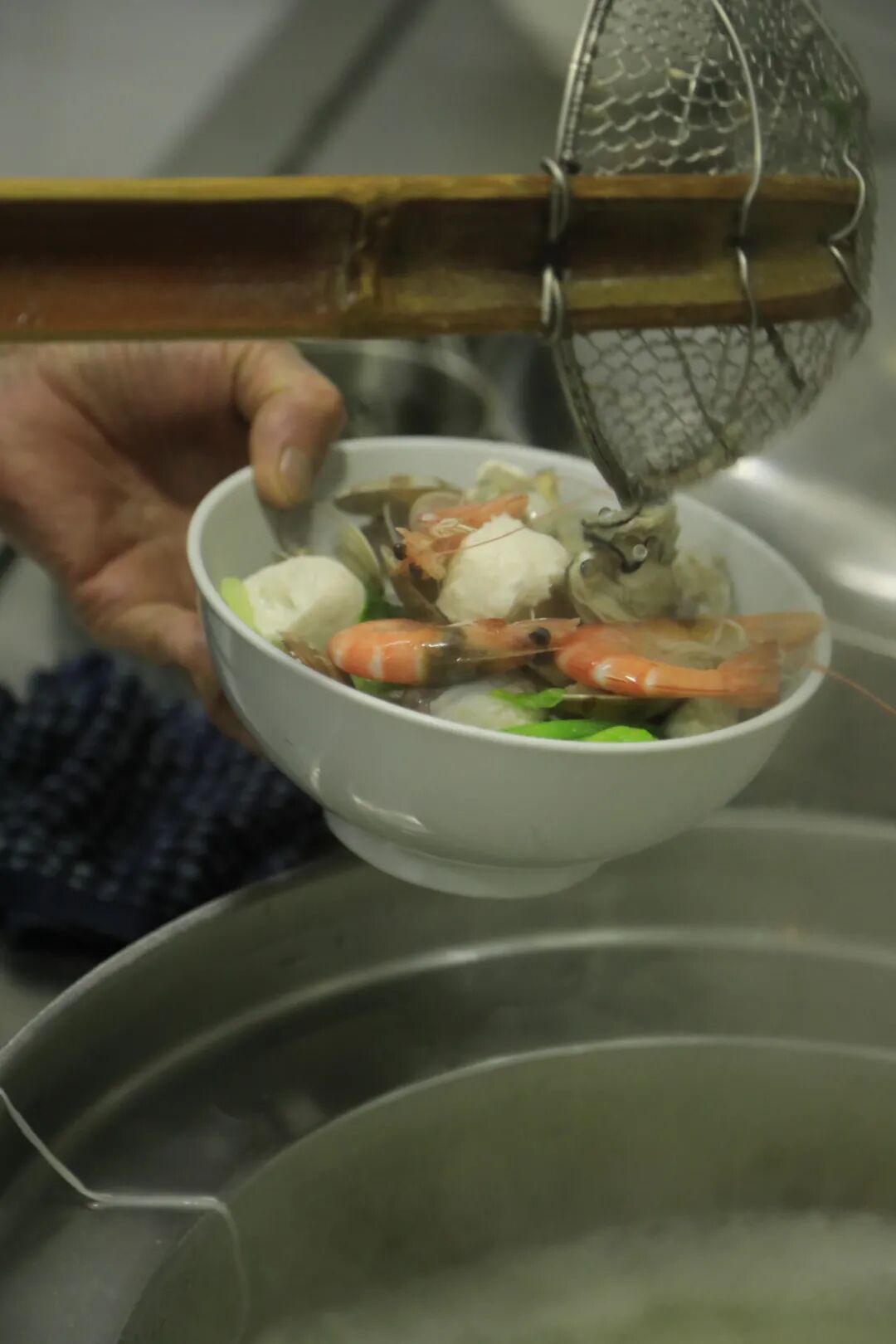 老伯伯叼着烟,泰然自若地不断从锅里捞出粿条、肉片。