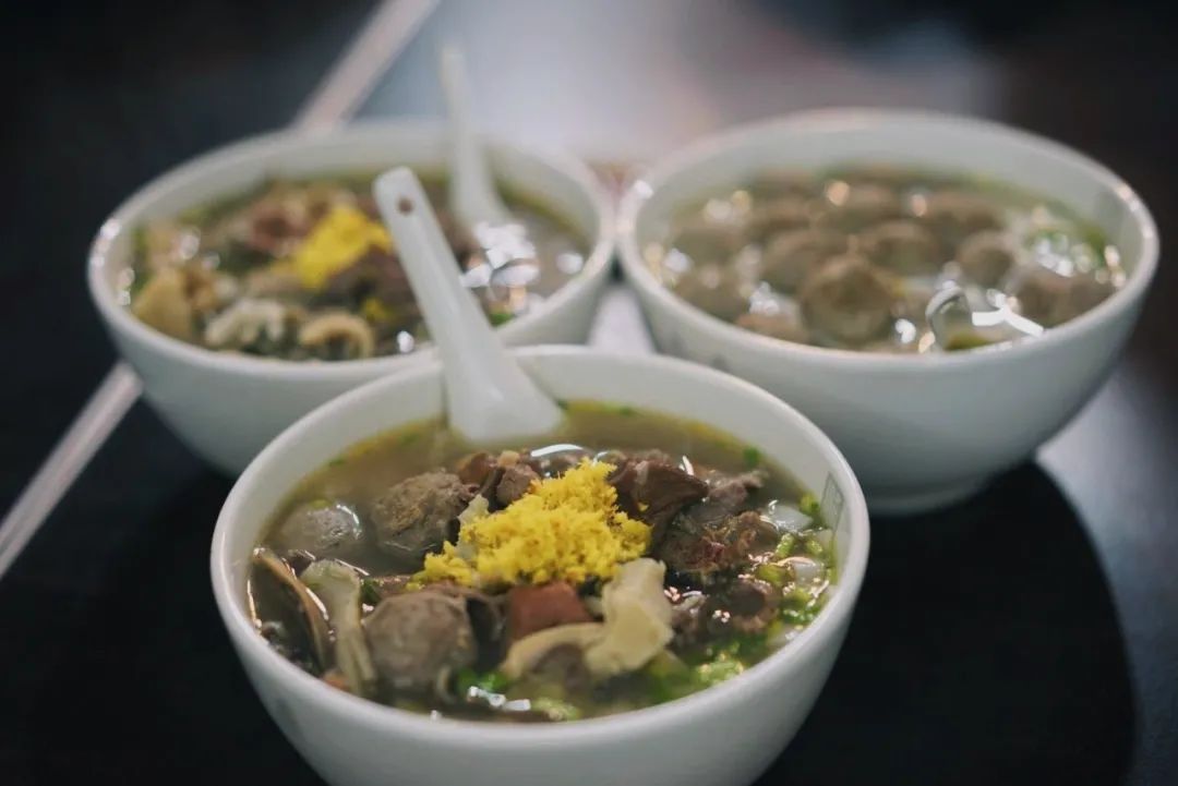 圆圆滚滚的大丸子配上滑溜的粿条,漂浮在透明清亮的牛肉汤上,里头还有姜丝或芹菜粒。