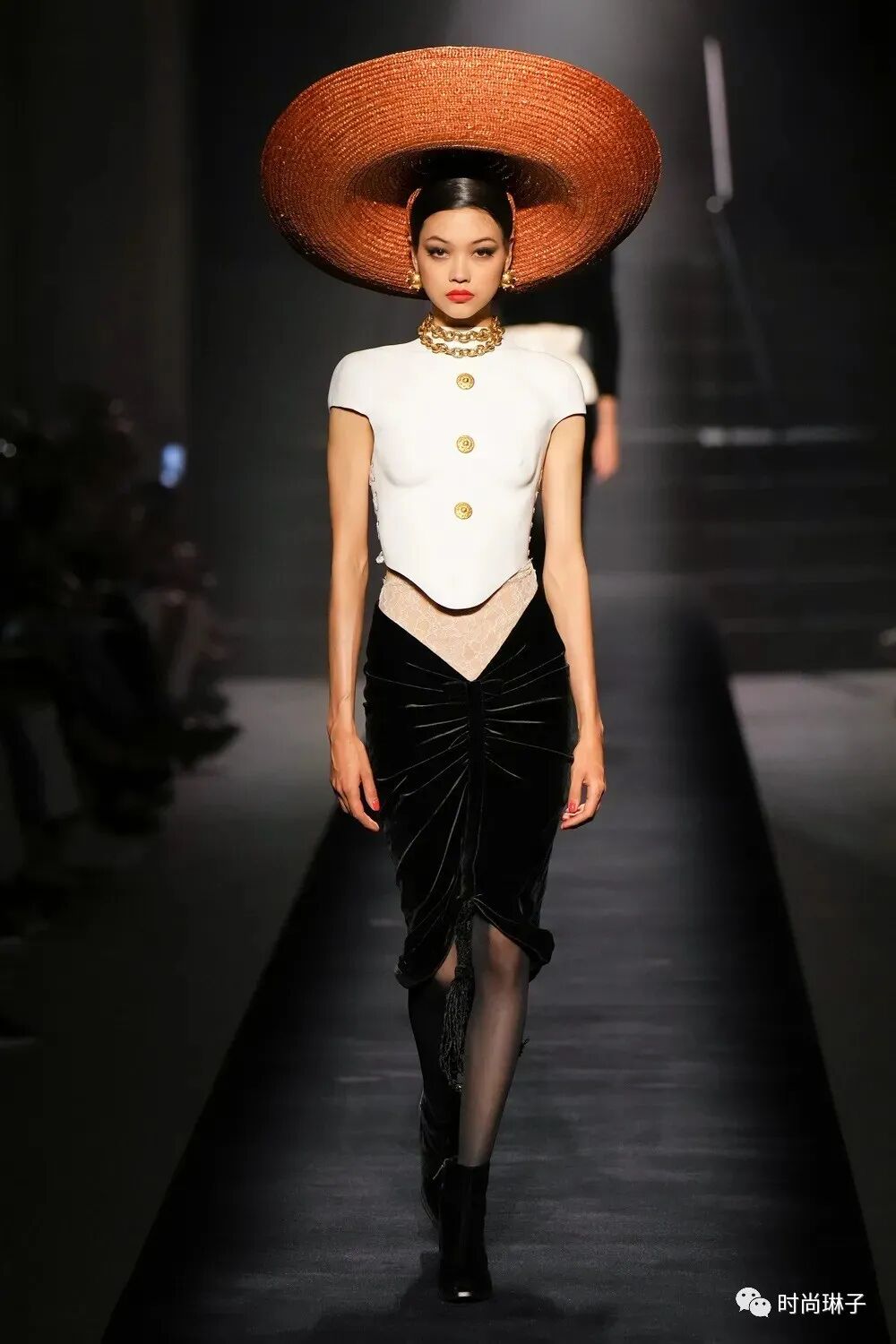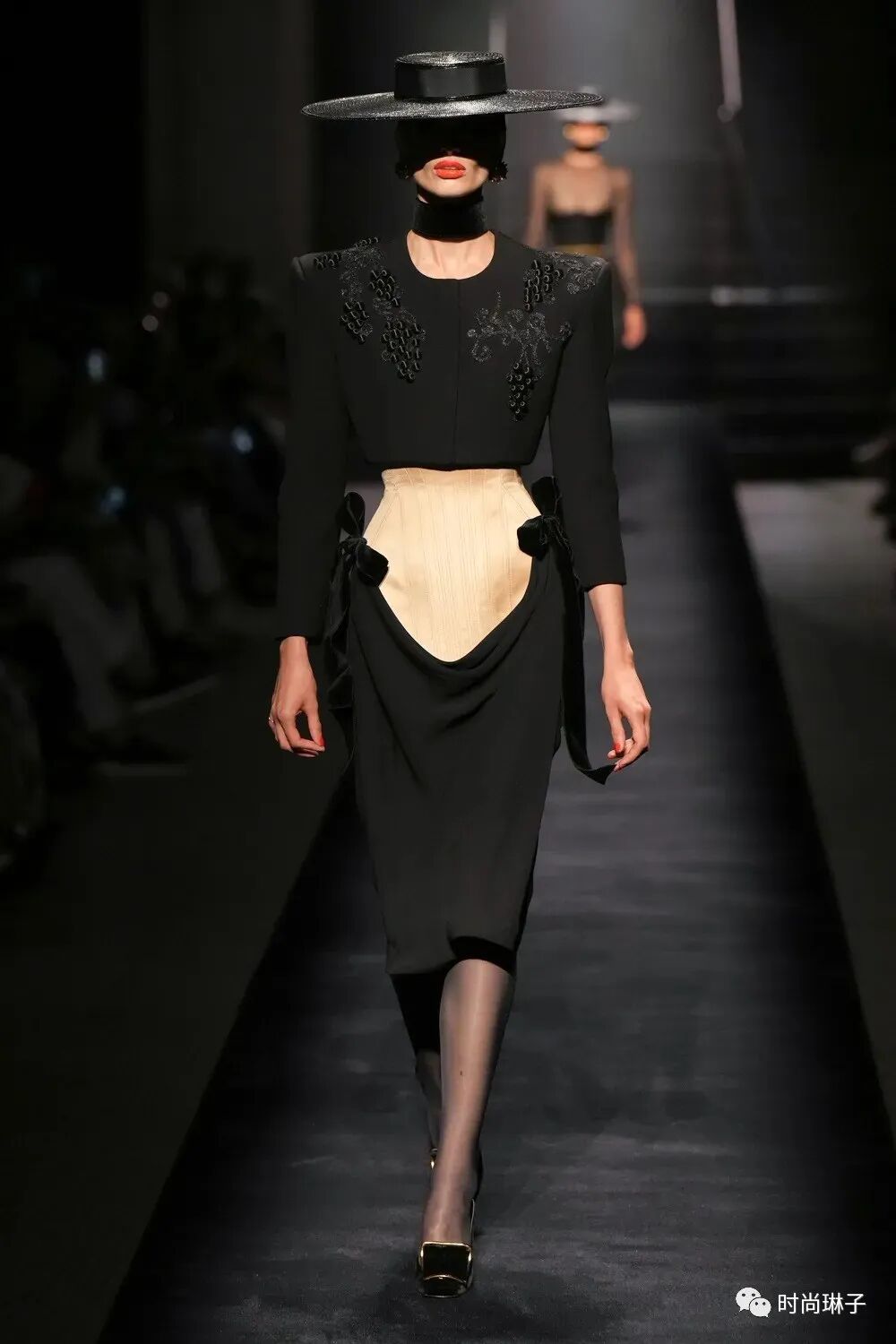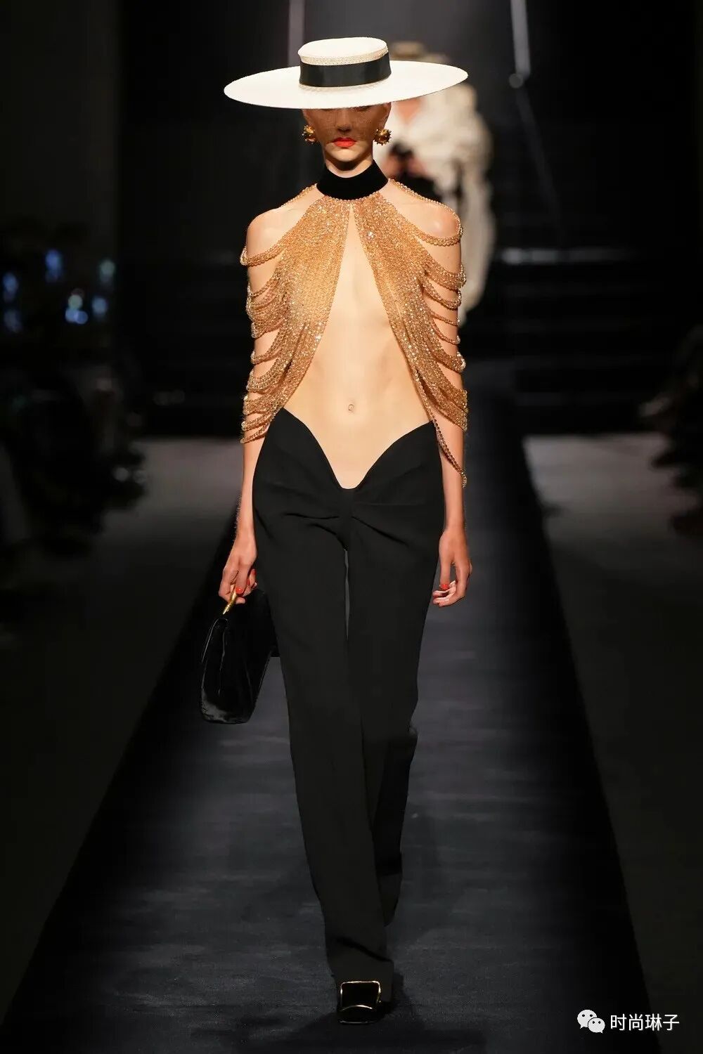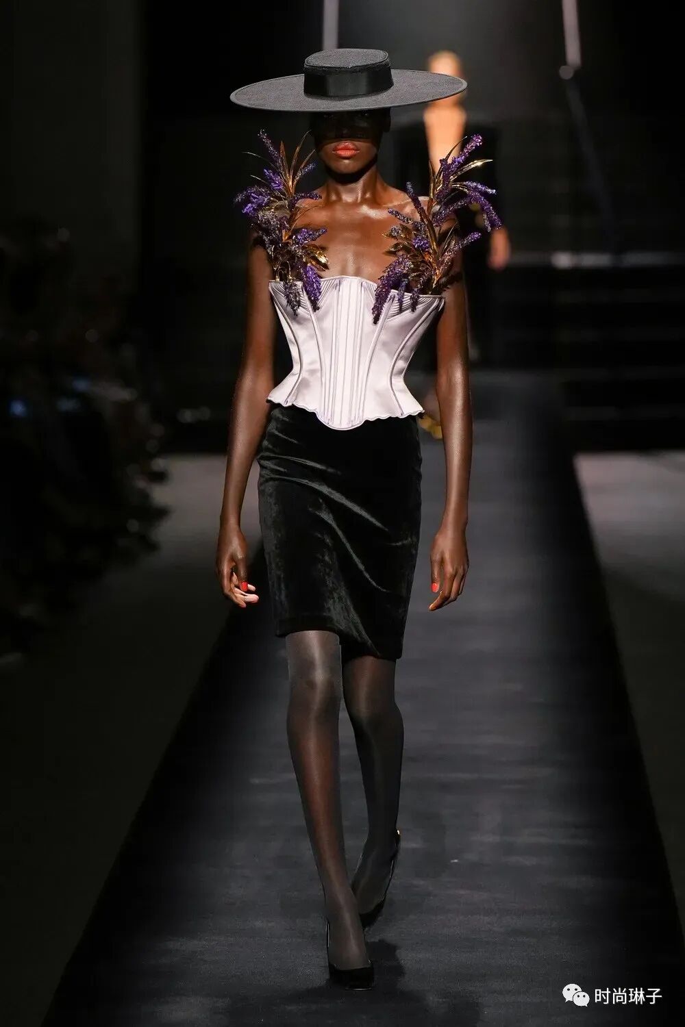 紧身胸衣及各种 Schiaparelli 标志性的廓形及经典设计搭配复古礼帽,以及各种镀金装饰,以现代风格诠释了品牌创始人的超现实主义艺术,颂扬女性身体之美。