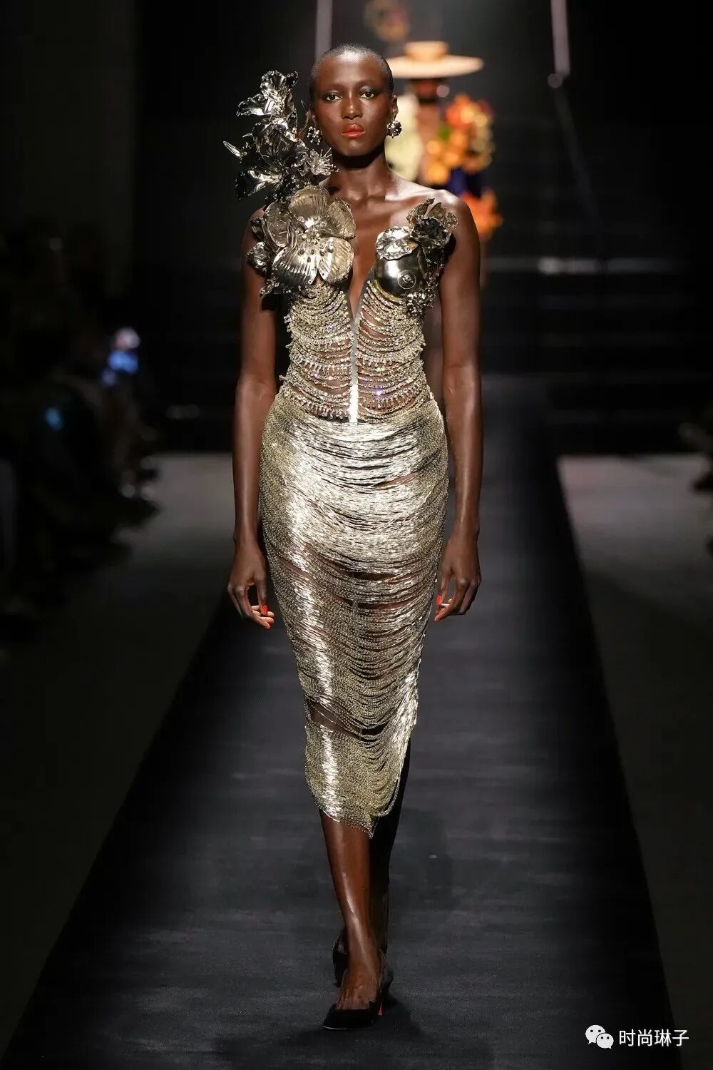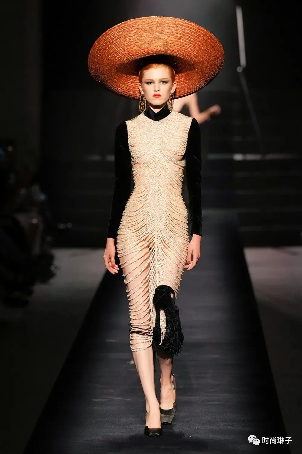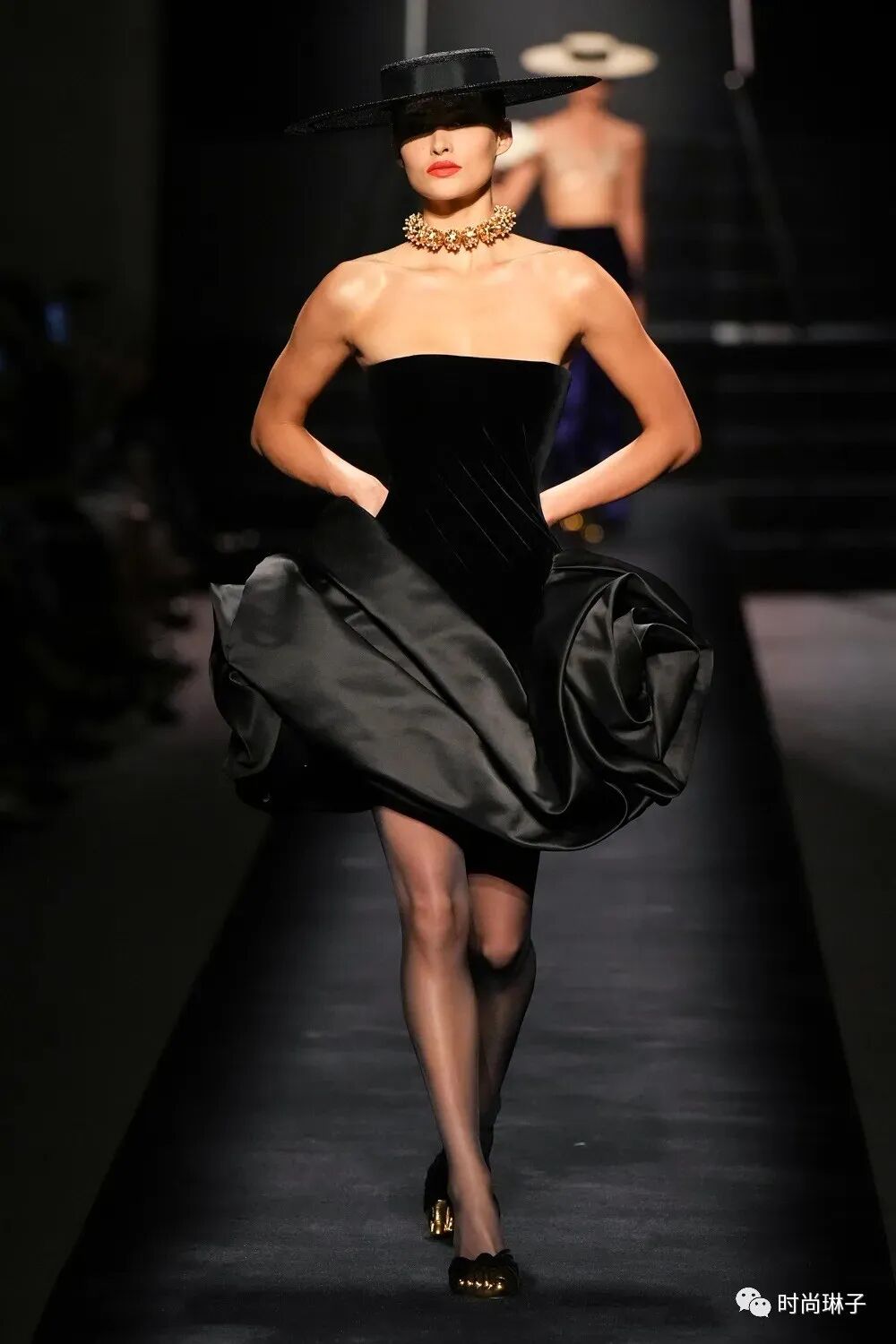 紧身胸衣及各种 Schiaparelli 标志性的廓形及经典设计搭配复古礼帽,以及各种镀金装饰,以现代风格诠释了品牌创始人的超现实主义艺术,颂扬女性身体之美。