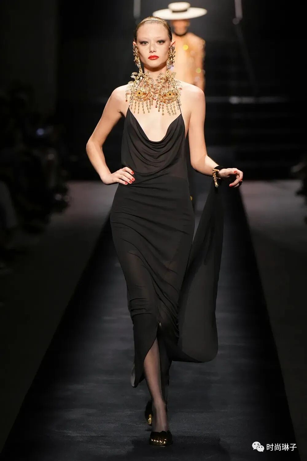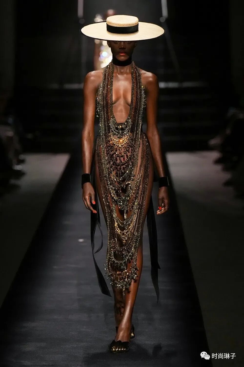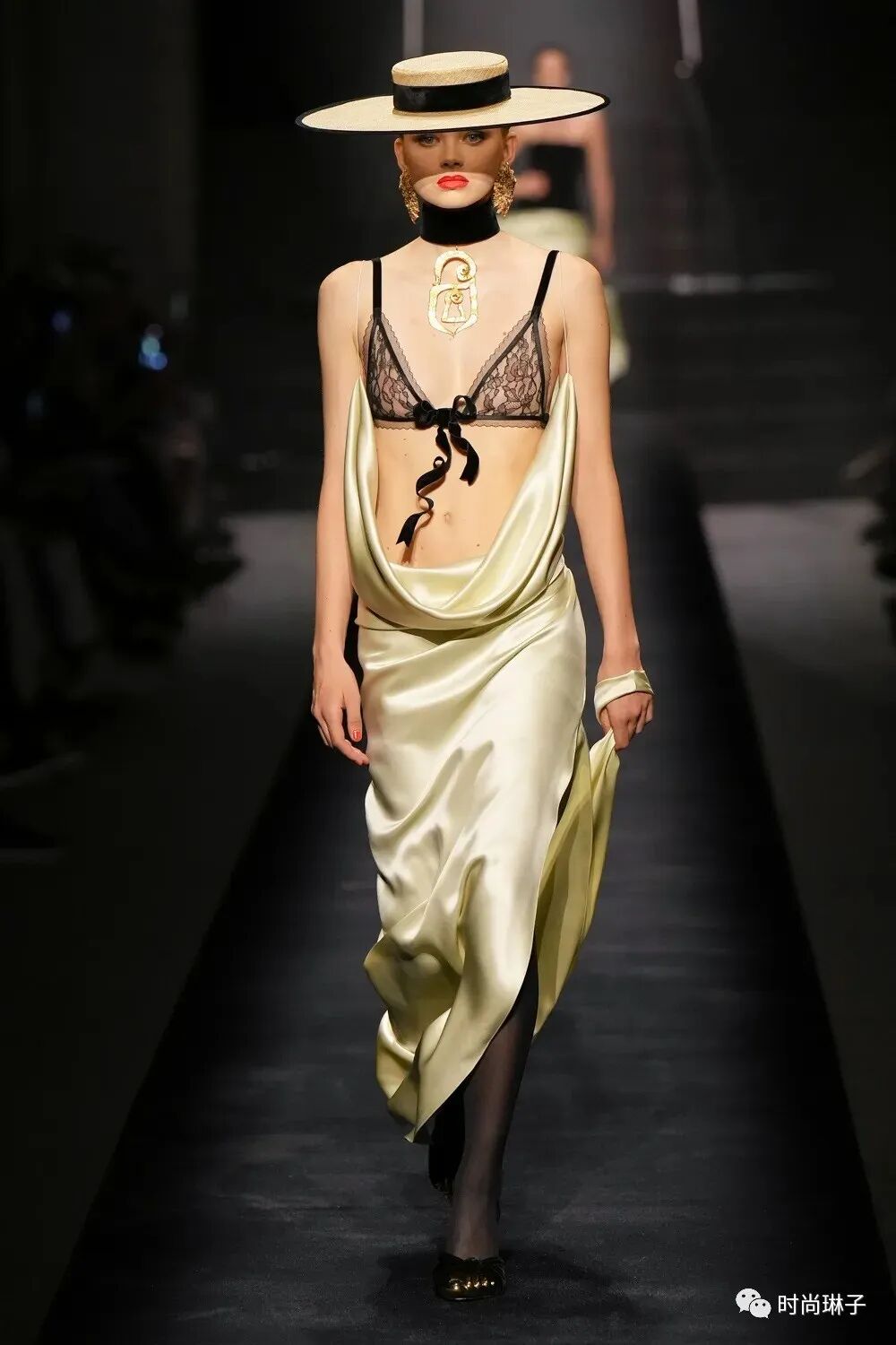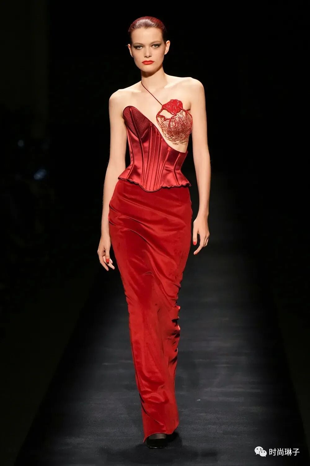 紧身胸衣及各种 Schiaparelli 标志性的廓形及经典设计搭配复古礼帽,以及各种镀金装饰,以现代风格诠释了品牌创始人的超现实主义艺术,颂扬女性身体之美。
