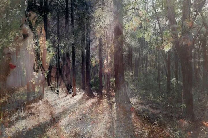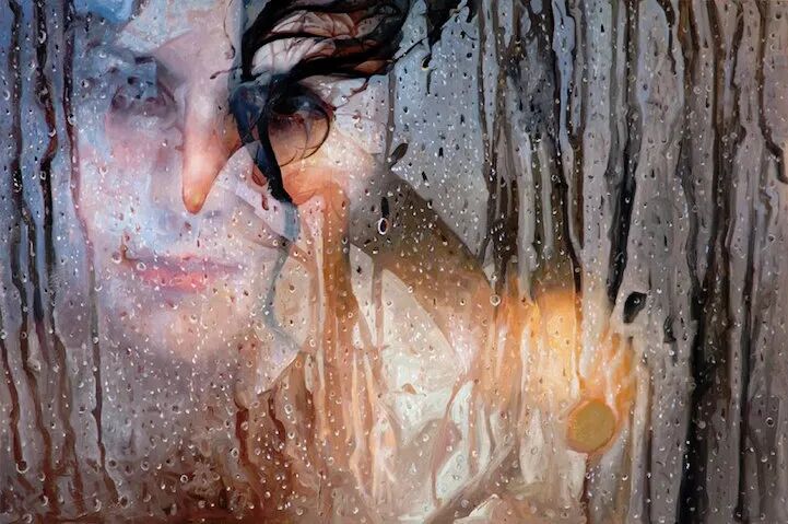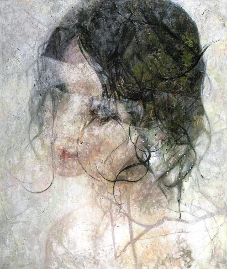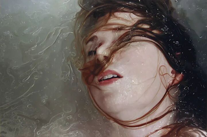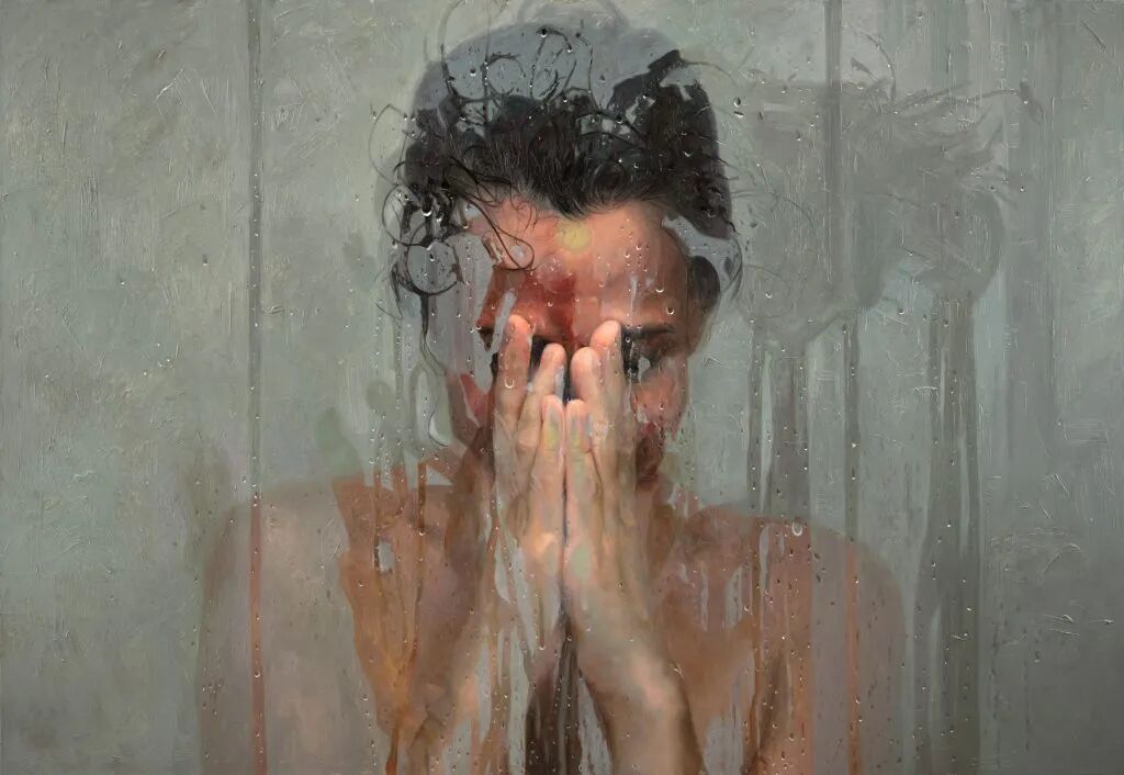 阿丽莎·芒克斯的作品看似超写实,又有着超现实的感觉,她的画作不是清晰地还原人物的面部五官,而是用玻璃、水雾、蒸汽、树叶等作为遮挡,人脸被隐在这些遮蔽物的后面,好像她与我们的距离隔得很远,让人看不清她的脸,却又能清晰地感受到她的长相。