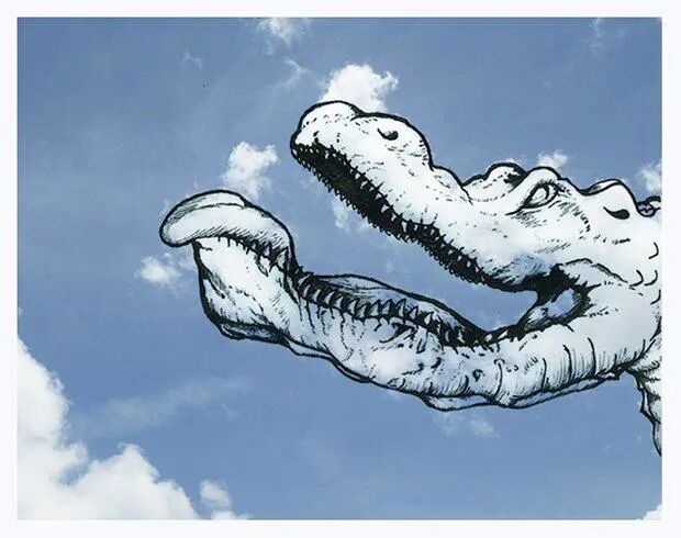 漫画家马丁·费乔就是这样一位艺术家,他创作了一系列天马行空的云端画作,与其说是画作,不妨说是结合了摄影与手绘的创意作品,这位艺术家在抬头望天,看到有趣的场景时,会用相机拍摄下来,然后再在照片上进行创作,根据自己的想象,描绘出各种东西,恐龙、鱼、乌龟、宇宙飞船......