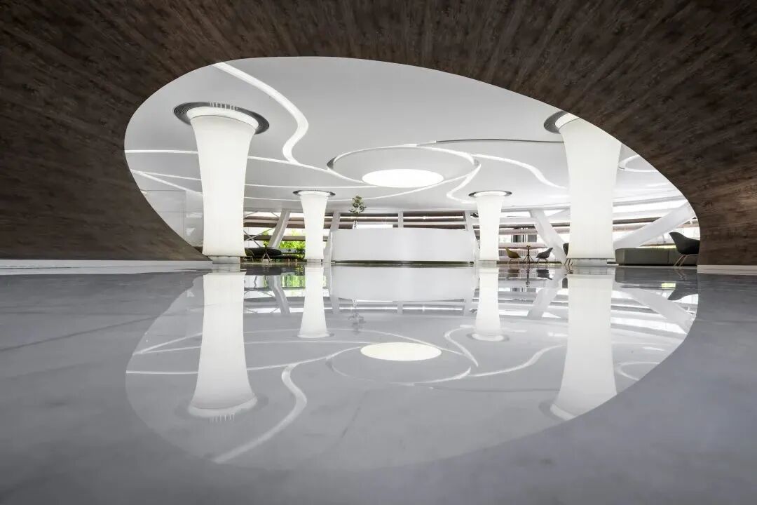 空间皆以曲线贯穿,每一条线都被赋予最大程度的张力,接待台作为下层空间的中心,以圆柱体造型聚焦视线,而分散在它周围的支柱系统,则被设计师作为发光薄膜灯具,顶部内嵌丝带形日光灯槽,穿插在柱子之间,勾勒灵动曲线。