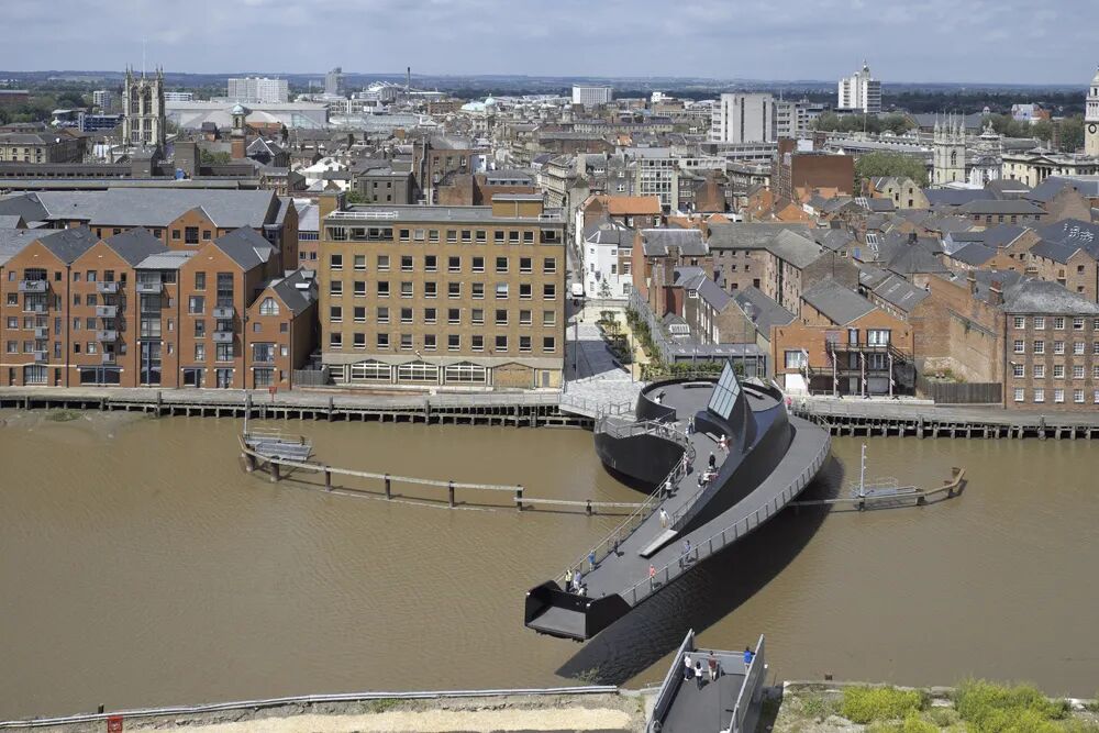 这座桥铰接在西岸旁边,悬臂高出水面35米,沿着中央脊柱的座位区让人们可以放慢脚步,欣赏河景。在视觉上黑钢和弯曲的形式指的是赫尔的工业和海洋背景,高架观景台上的无缝钢栏杆让人有一种站在船甲板上的感觉。