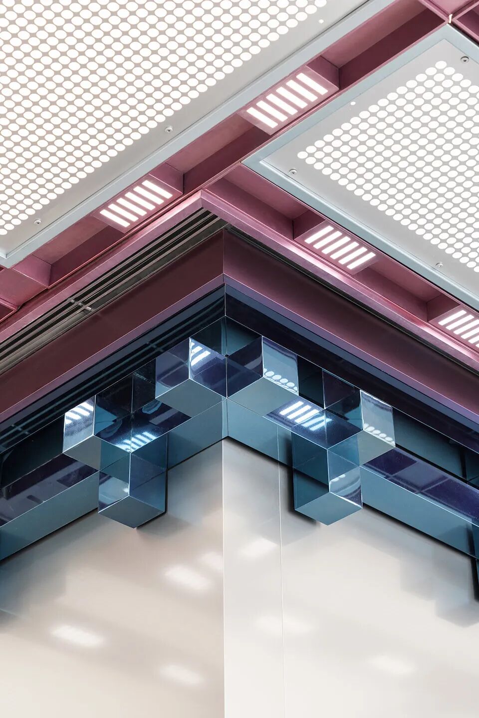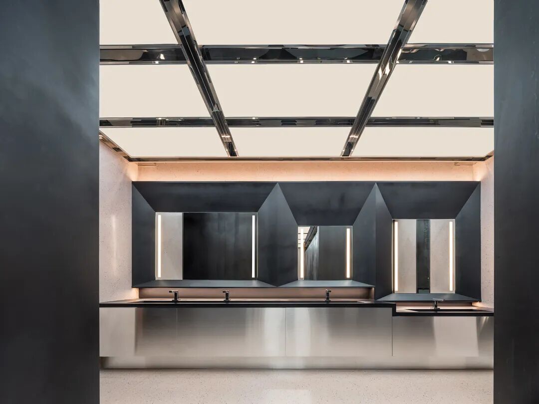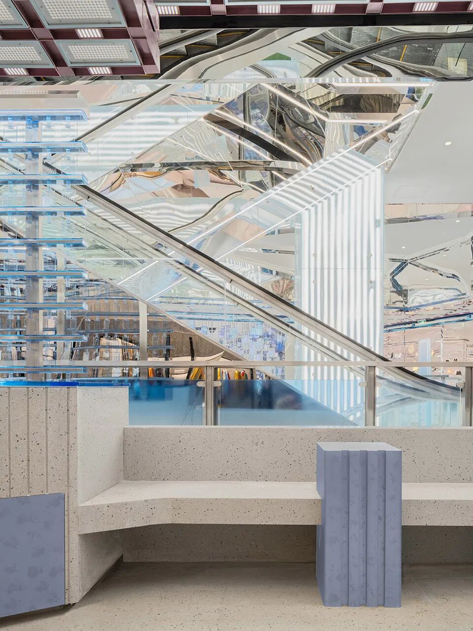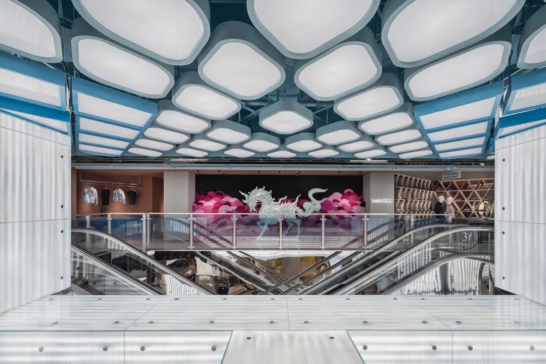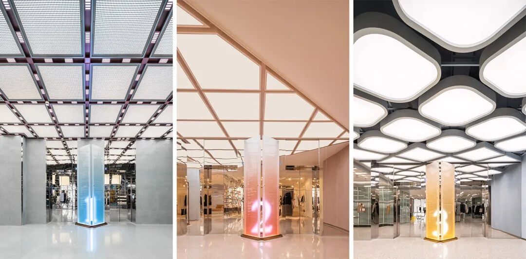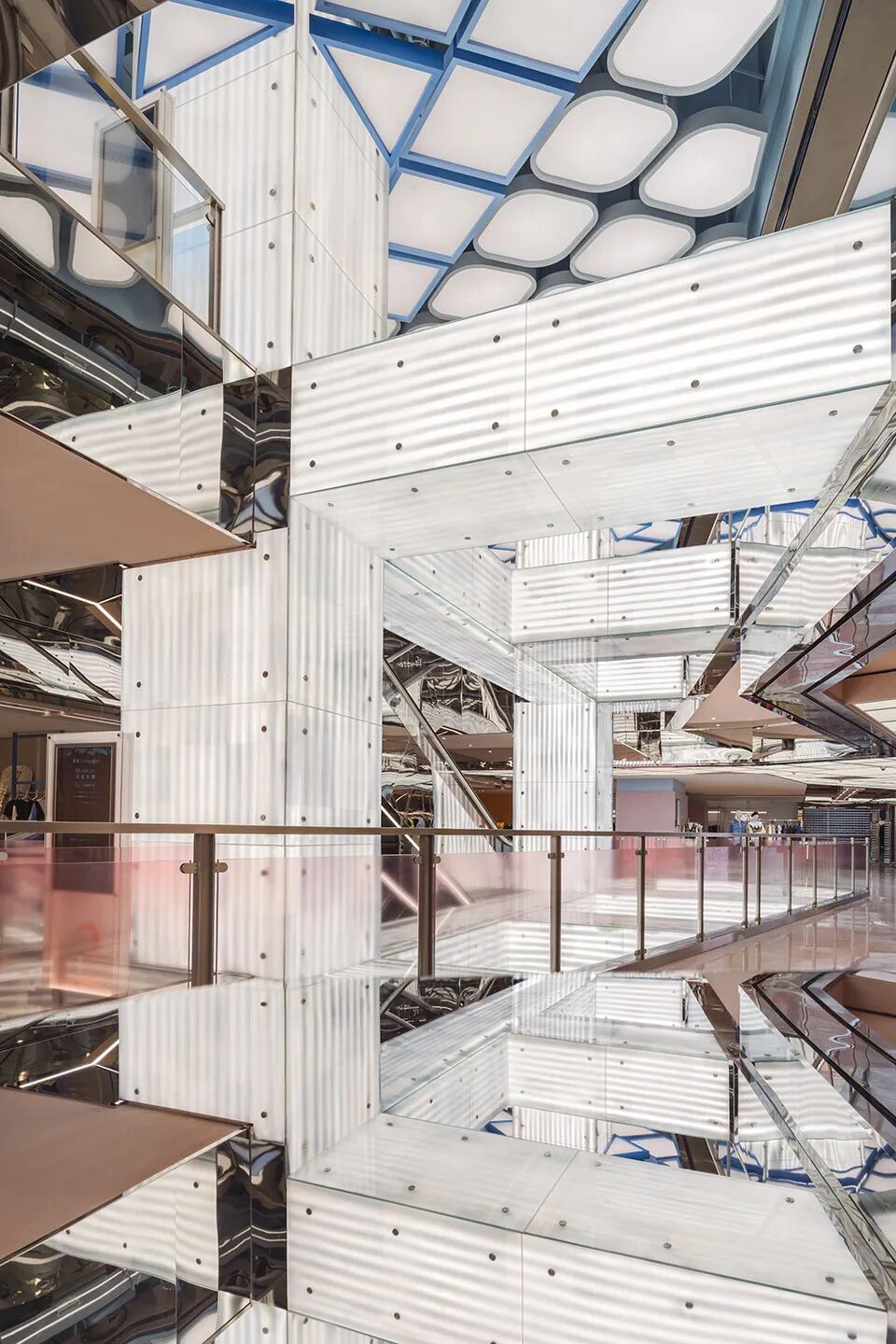 形塑东安为一层空间主题,这里是设计重点——中式建筑结构的首次变幻。团队借鉴了传统中国建筑中天花板和柱子的结构,创造出如青山掩映的诗意钢铁庭院一般。
