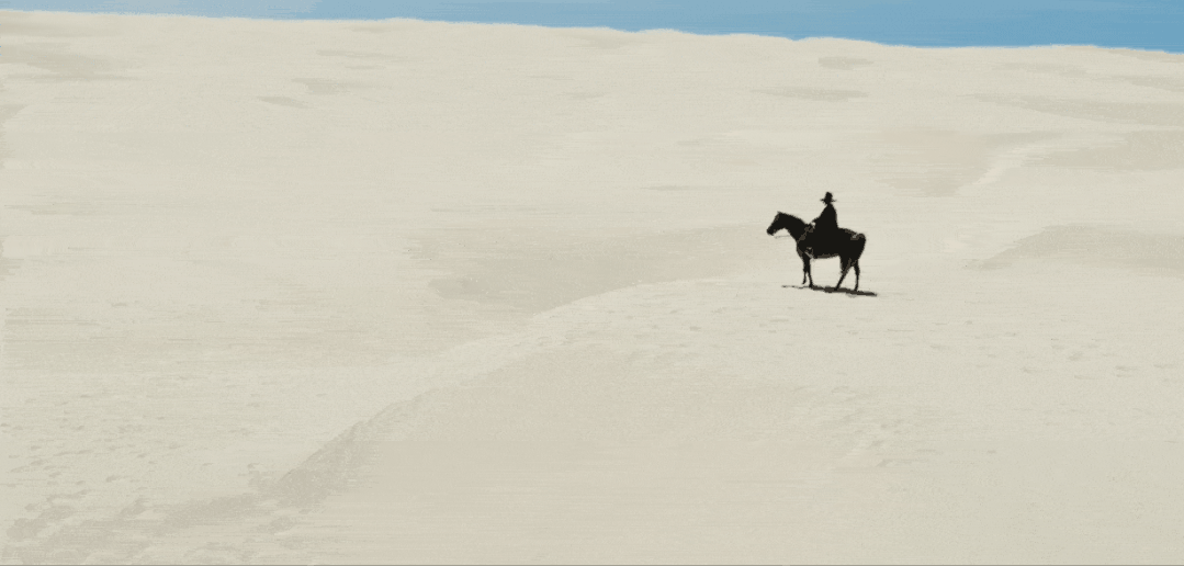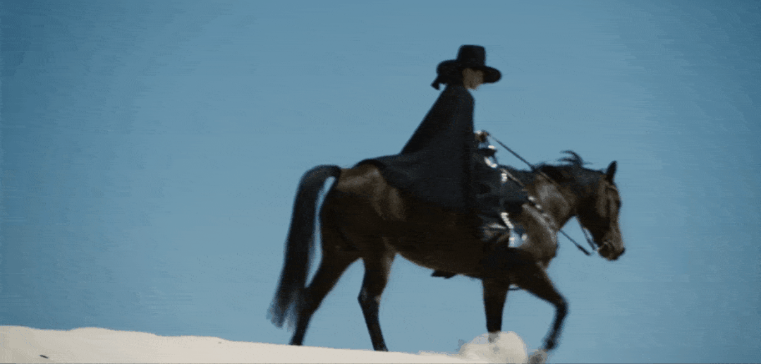 在空旷无垠的沙漠,一个神秘男人子俯视着昏迷的 Lady Gaga。