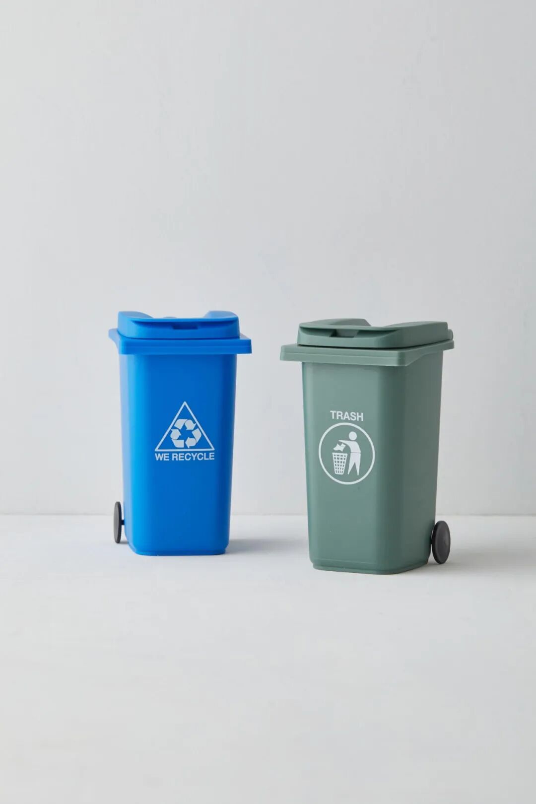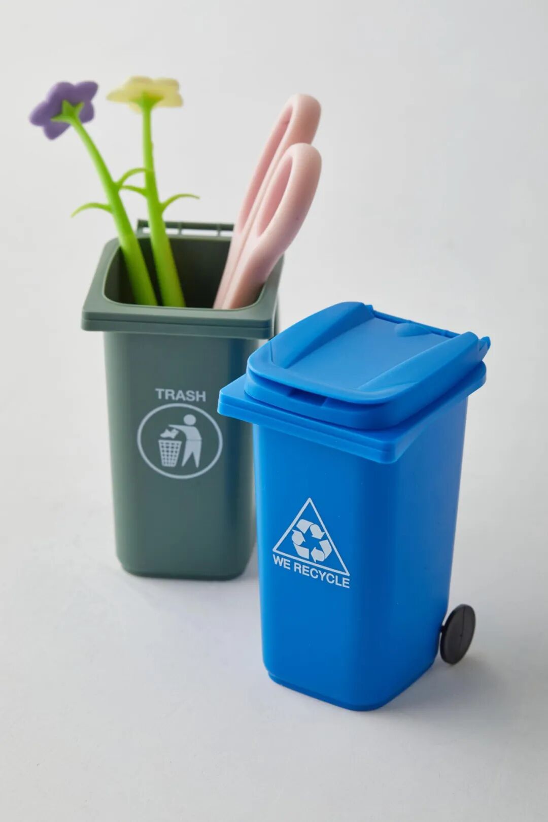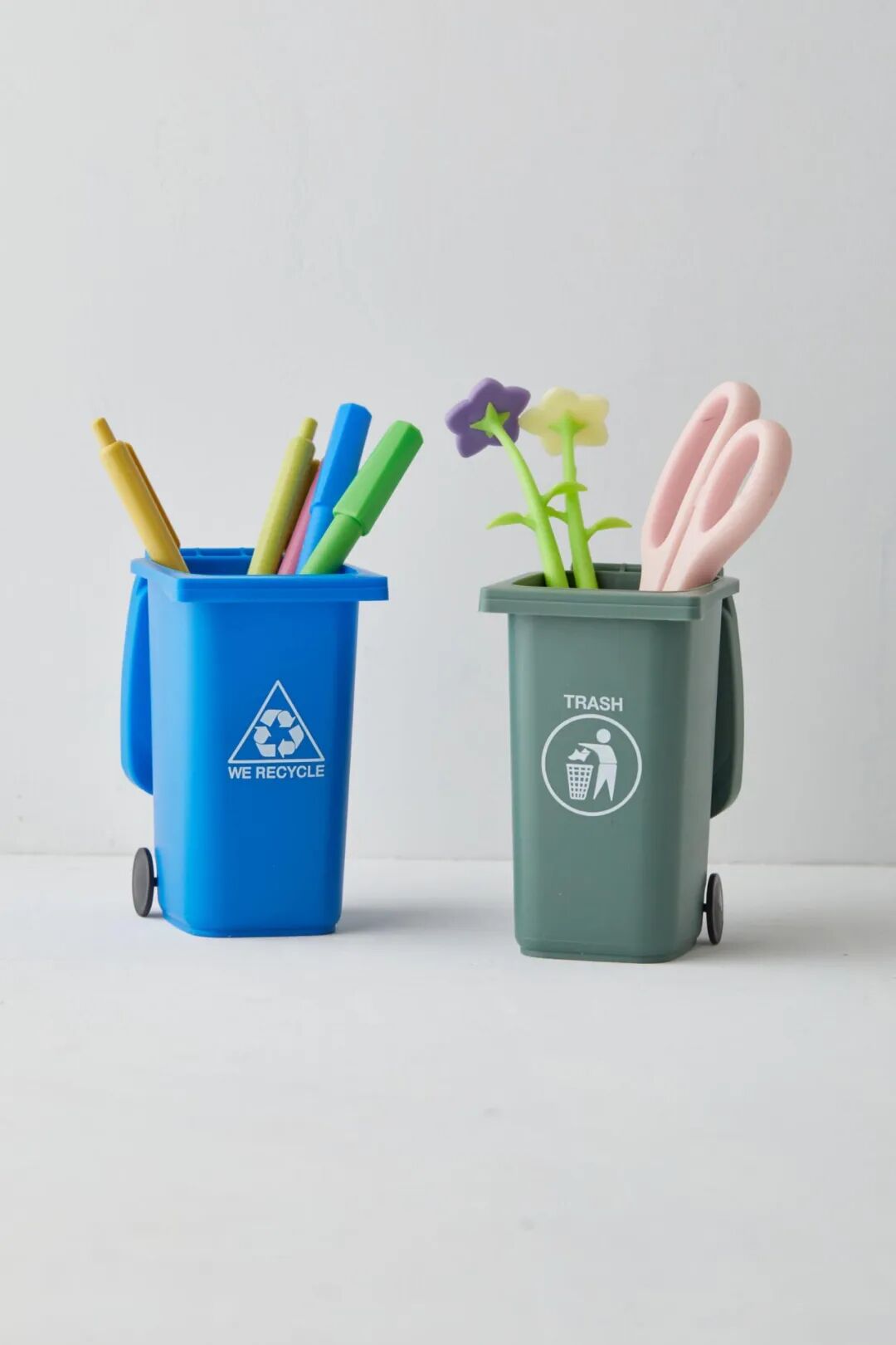 用这套形状像微型垃圾桶的笔筒重复使用和回收您的书写用具。配有可关闭的盖子和轮子,您可以在办公桌上随意移动。