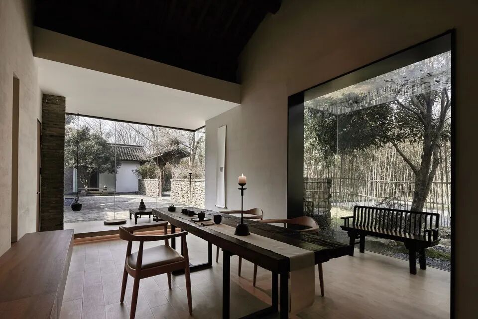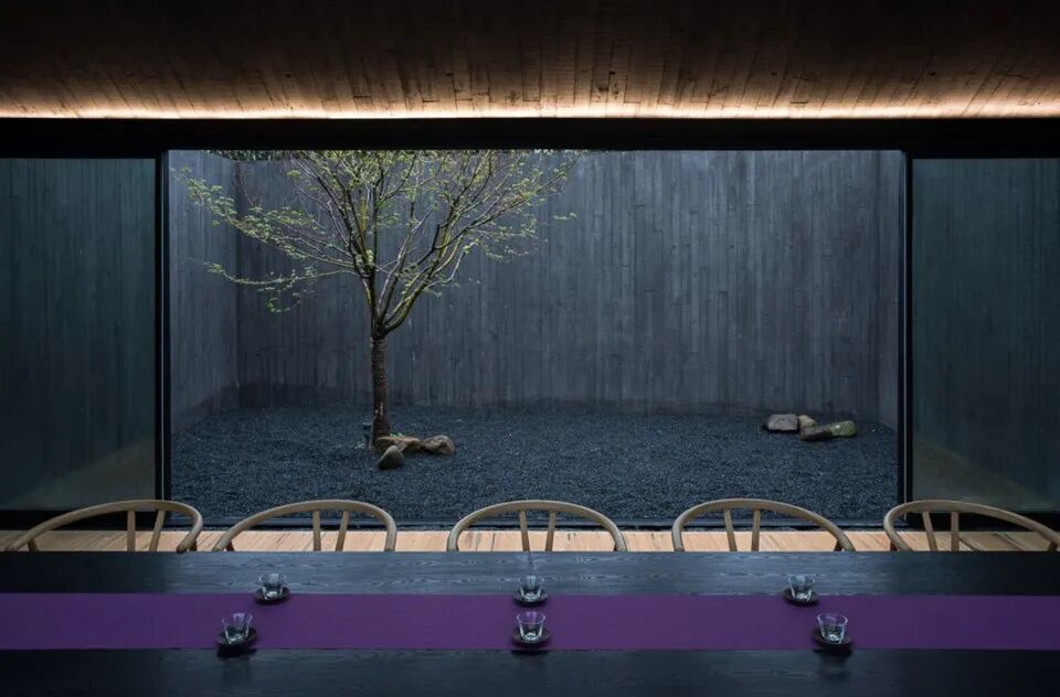 庭院茶室东西两侧的玻璃门,都是可以完全打开的,西侧面向外面的自然景观,如同框景。东侧是一个抽象的庭院,和一棵孤立的树。
