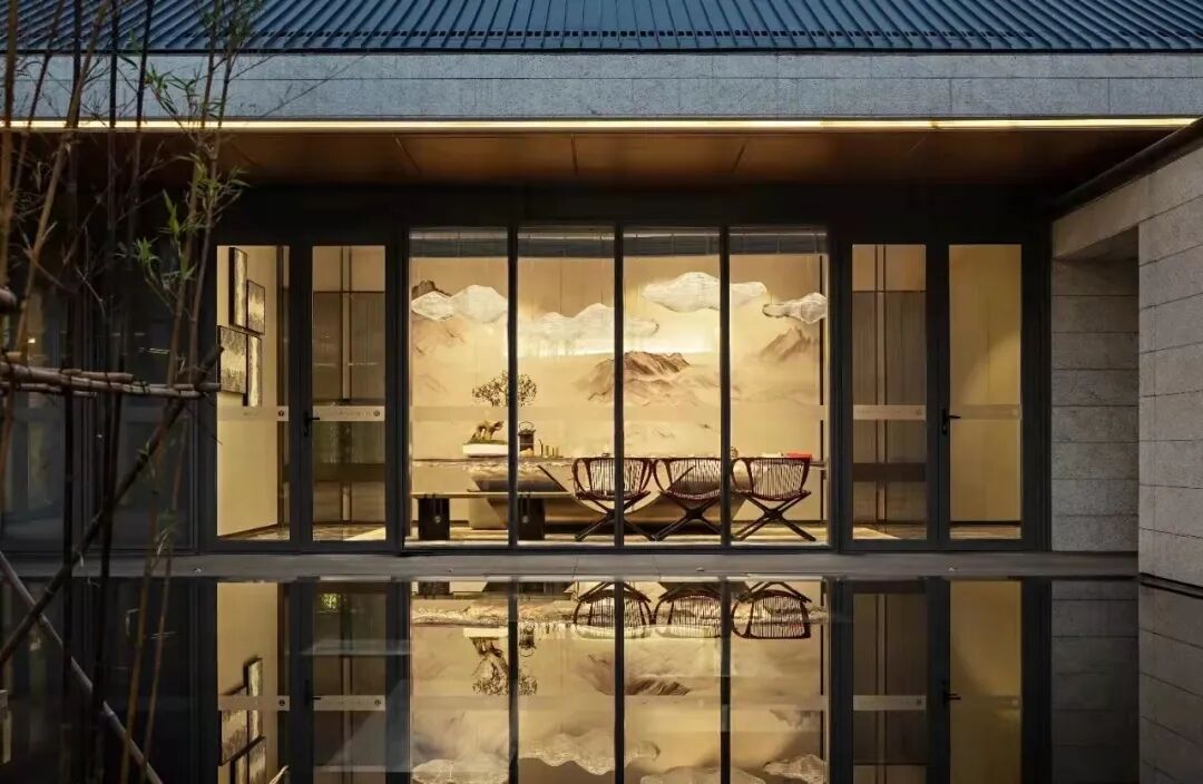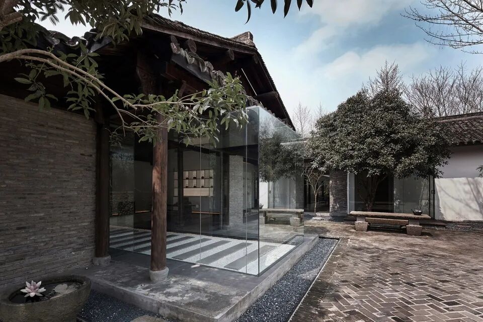 设计师在保护传统柱梁结构的基础的上,为设计做了减法,采用了大落地玻璃,露出建筑本身的骨架,入口处的大玻璃盒子代表了一个无形的界限。走入其中,有种虚实之间交错之感,颇有佛法中“一切有为法,如梦幻泡影”的意味。