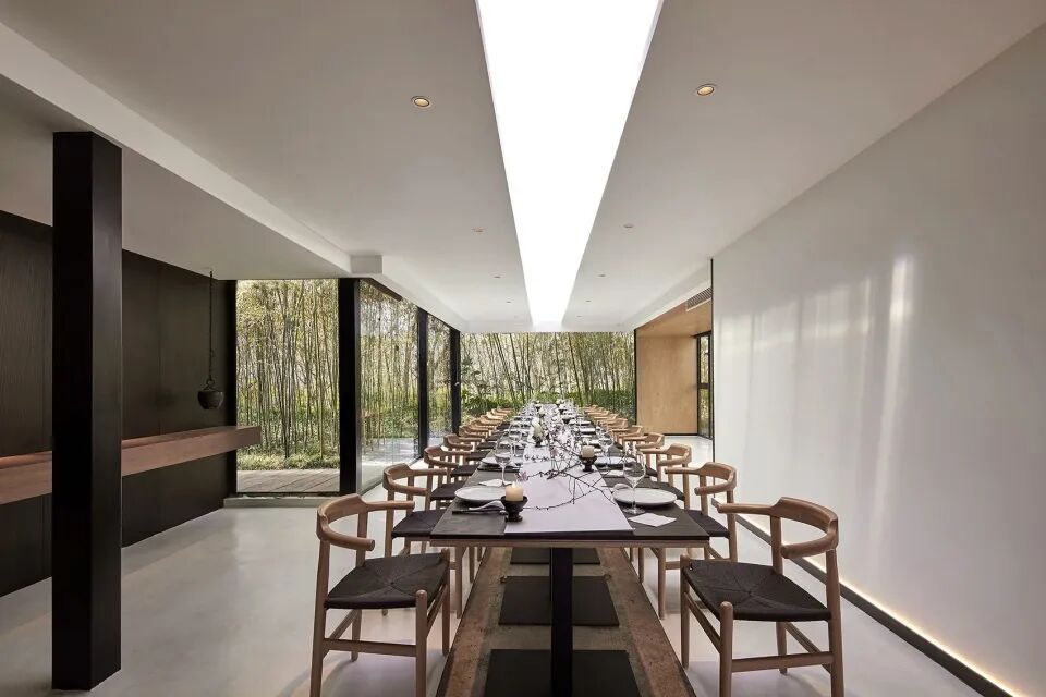 餐厅设计概念是把一个“玻璃盒”置入竹林风景中,自然与空间结合地淋漓尽致。体现出了传统与现代共生,人建筑与自然共生的理念。