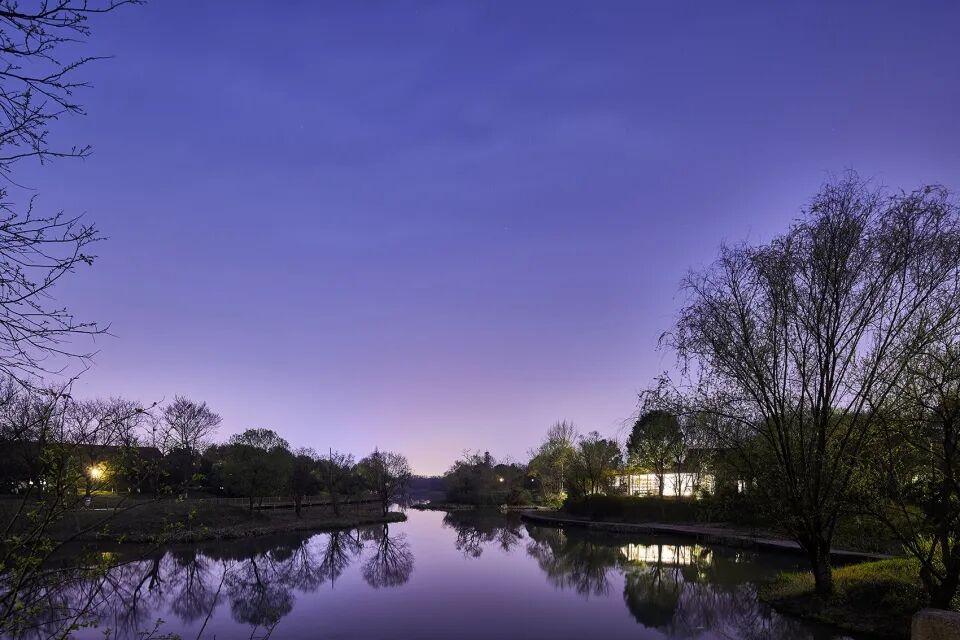 下午,太阳及其在水里的反射,通过圆洞会形成两个投影光圈,随夕阳西下而慢慢交汇。
