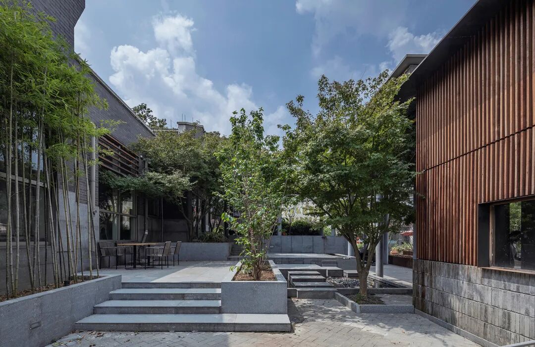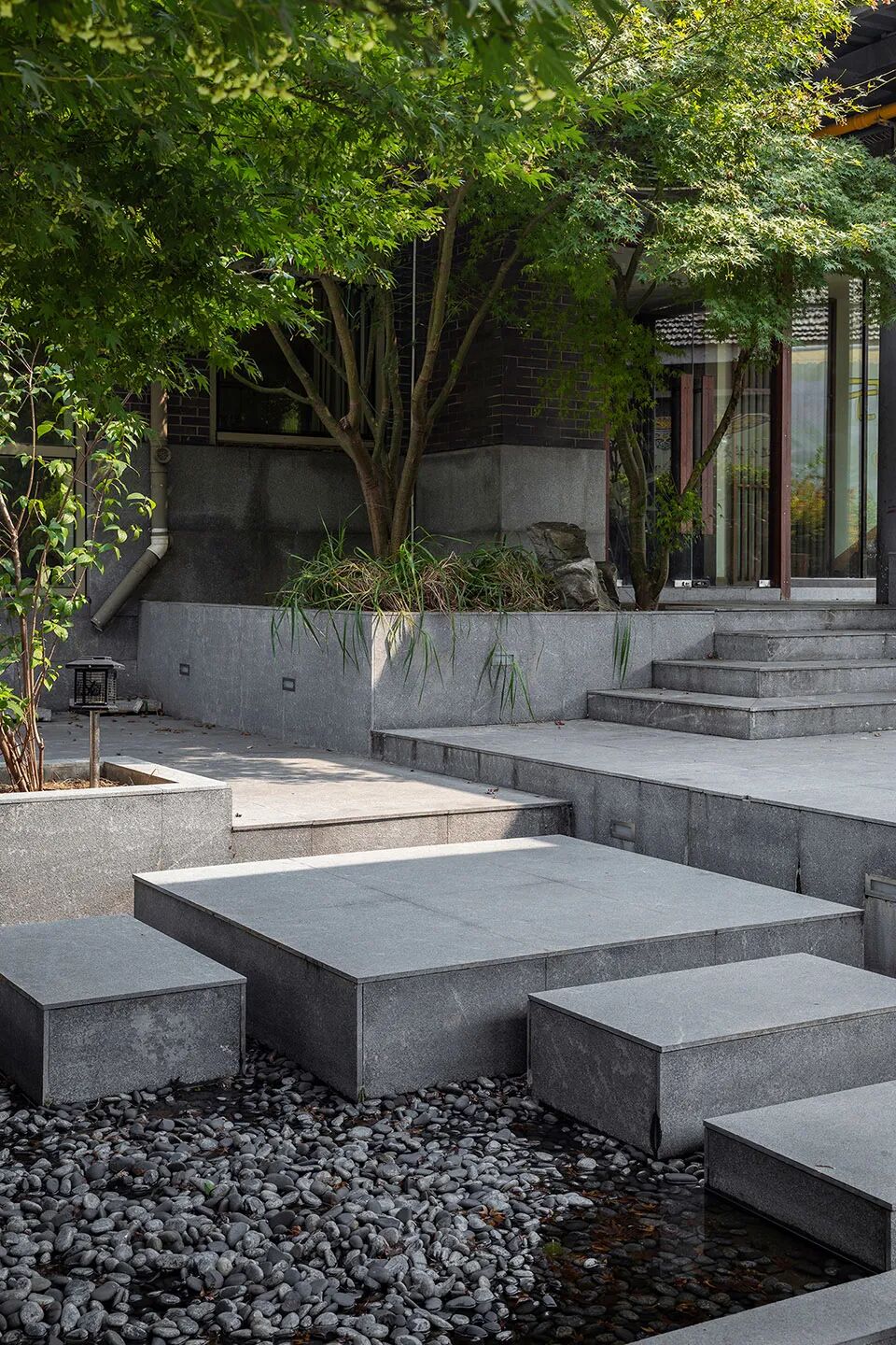 室外庭院由不同高度的花岗岩台阶和平台组成,各个小空间被水池和树木区隔,同时,树木为室外座位提供了幽静且舒适的环境。