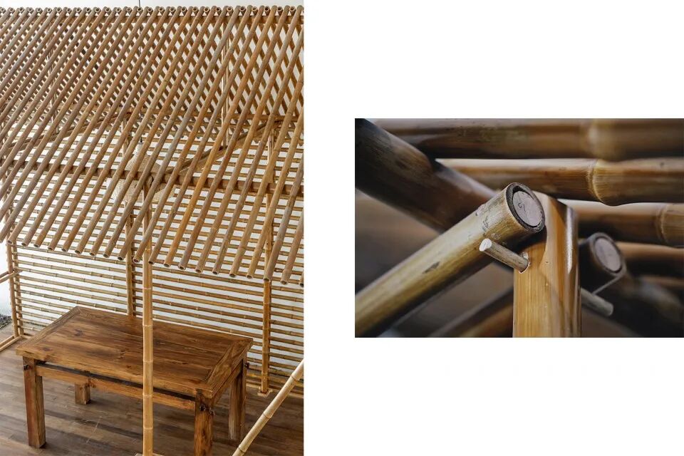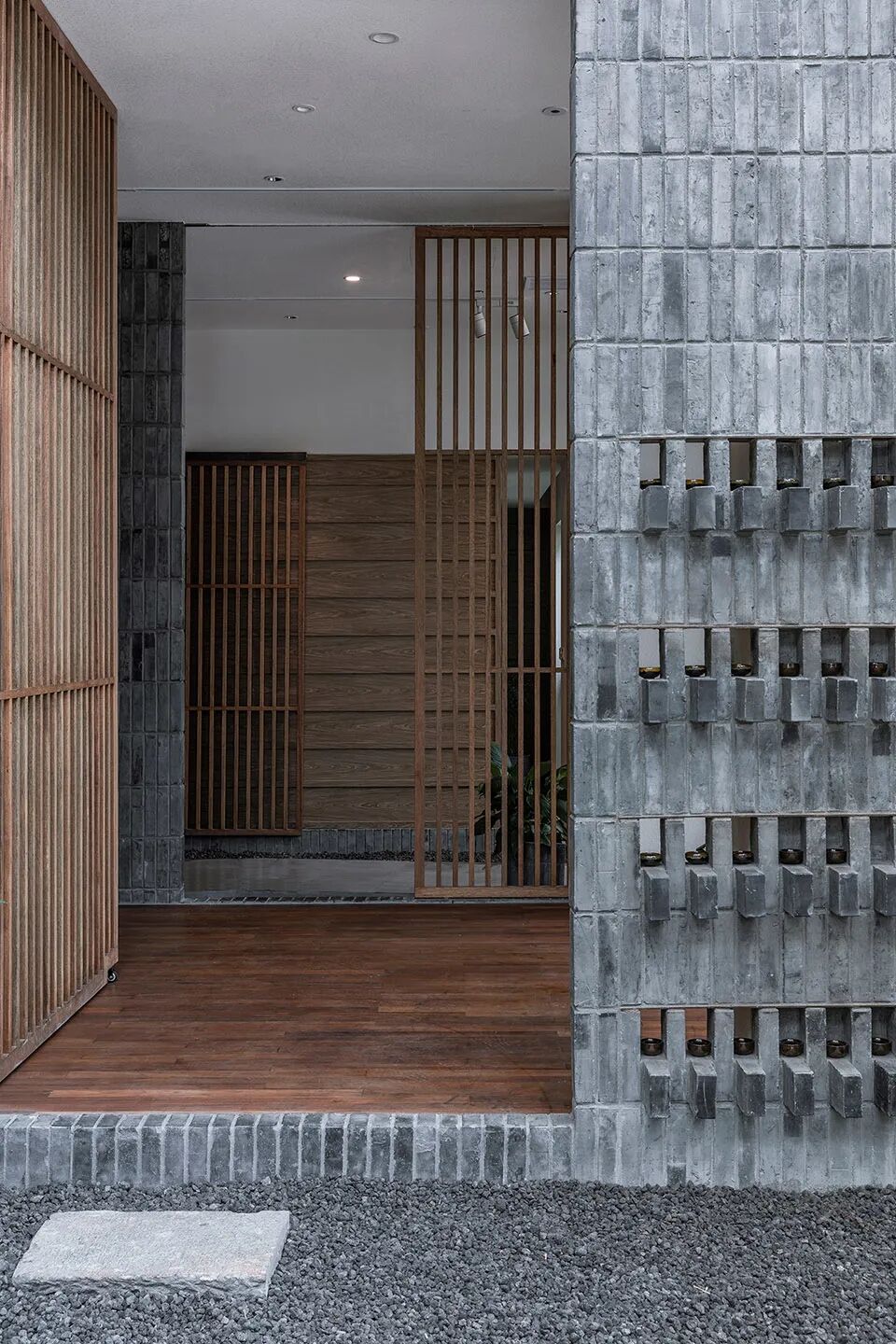 建造上,主要的材料是简单朴实的砖、木头、石头、竹子。砖墙在垂直方向上将空间进行区隔,局部挖空使空间相互渗透,木格栅以推拉、摆动的方式建立茶室的开合系统。