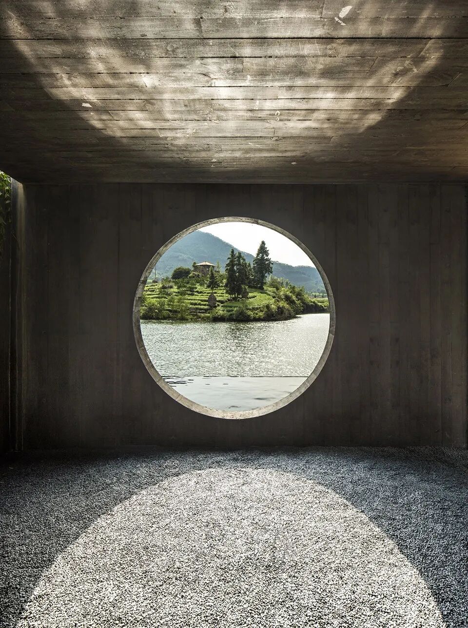 南端尽头的冥想空间面向西侧湖面,既可以作为庭院茶室的延伸也可相对独立,圆形开口是向外观景的景窗,更是一个借入自然的转换器。