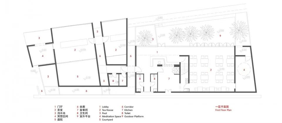 室内大部分面积为私密性较高的茶室包间,分散排列在空间中,由石质走廊相连接。茶室包间由砖墙包围,在功能上满足了空间的私密性。