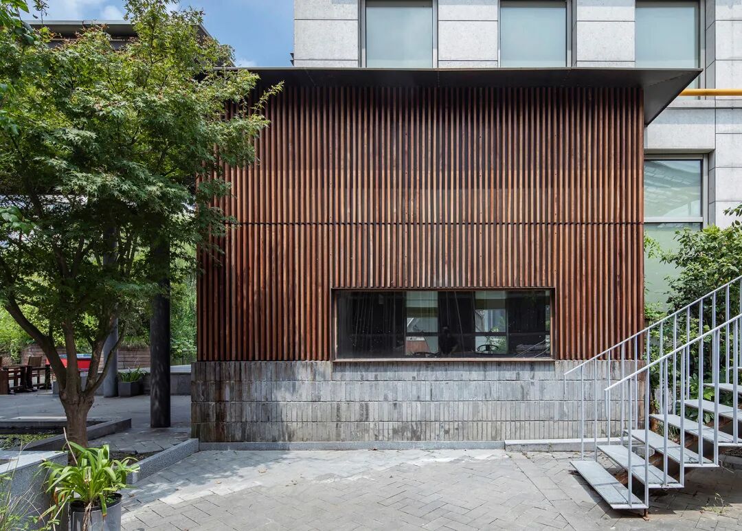 同时,木格栅和墙体间的缝隙,又使空间保持了开放的态度。在材料的选择上,由重到轻,由实到虚,多种透明度不同的材料并置,共同塑造了这一空间。