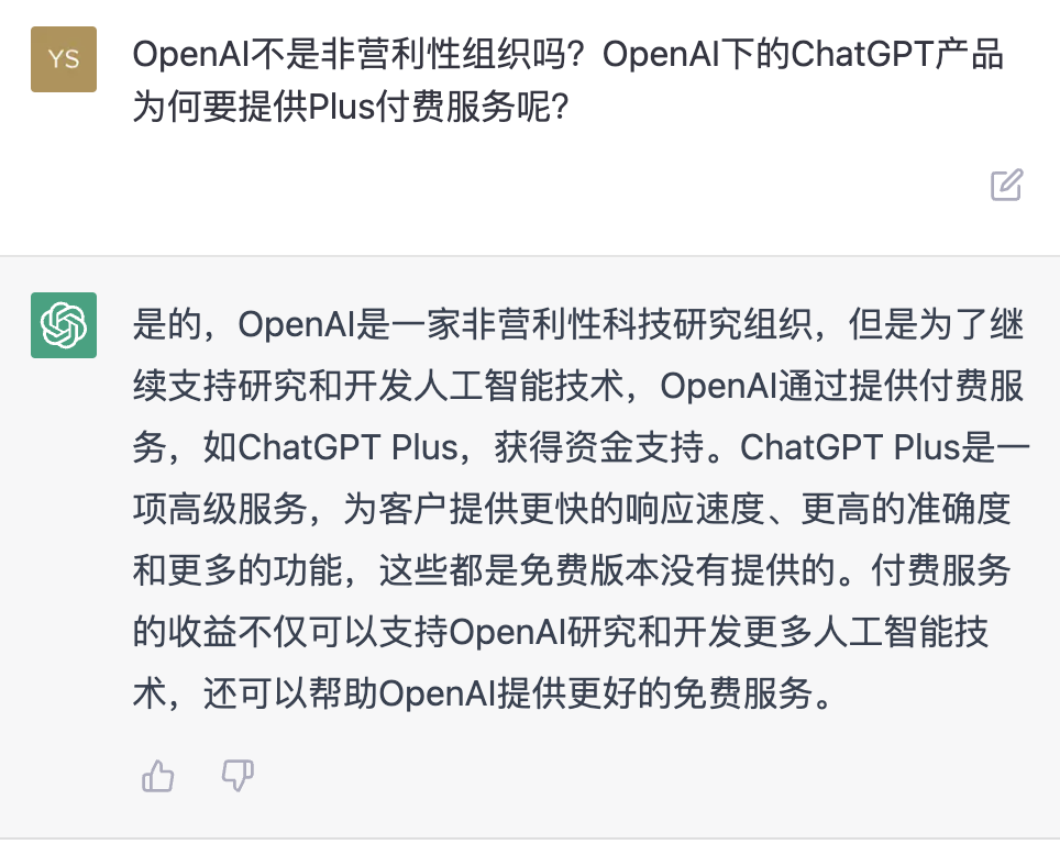 最后,我问了一嘴ChatGPT:OpenAI不是非营利性组织吗?OpenAI下的ChatGPT产品为何要提供Plus付费服务呢?