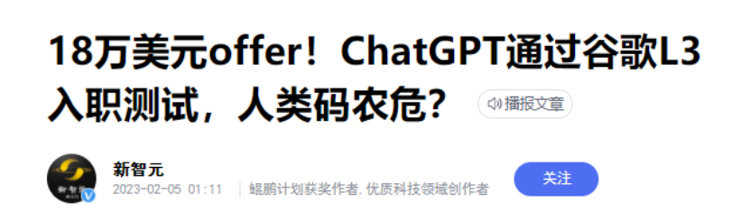 Google向ChatGPT发放了自己招聘程序员时的面试考卷,根据作答质量,给出了L3级工程师的offer,这在Google内部算是初级工程师岗位,平均年薪为18.3万美元。这是码农们的恐怖故事。