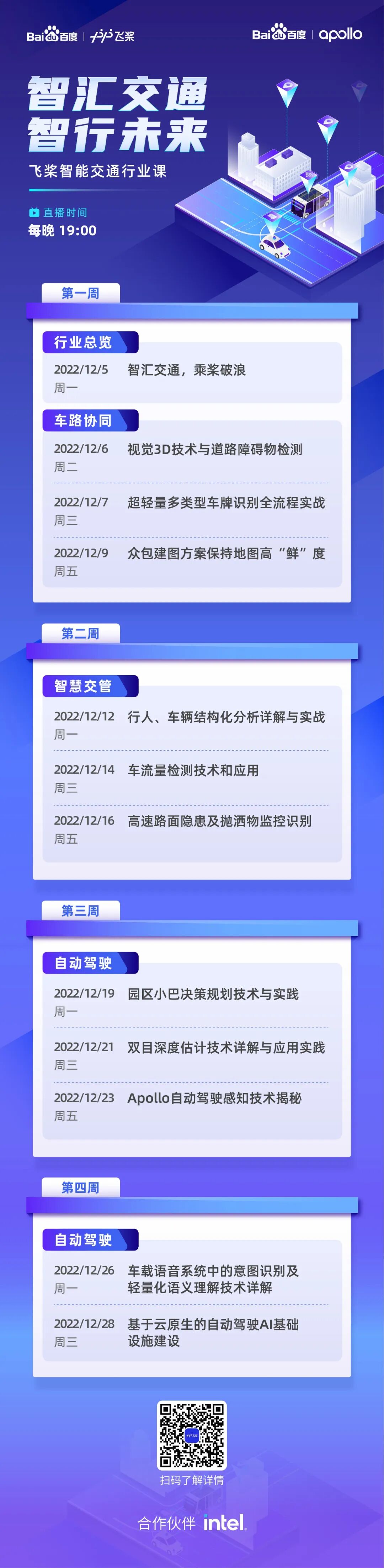 为进一步加速交通科技行业人工智能融合创新与产业落地,百度飞桨联合百度智能交通、百度自动驾驶、百度视觉技术部、百度智能云、百度机器人与自动驾驶实验室等团队联合举办主题为“智汇交通,智行未来”的行业经验分享课程,重点围绕人工智能、深度学习技术在交通行业的产业实践与发展趋势,邀请行业内专家共同探讨科技交通强国的未来发展趋势、分享典型场景的产业实践,加速我国交通行业的智能化升级。