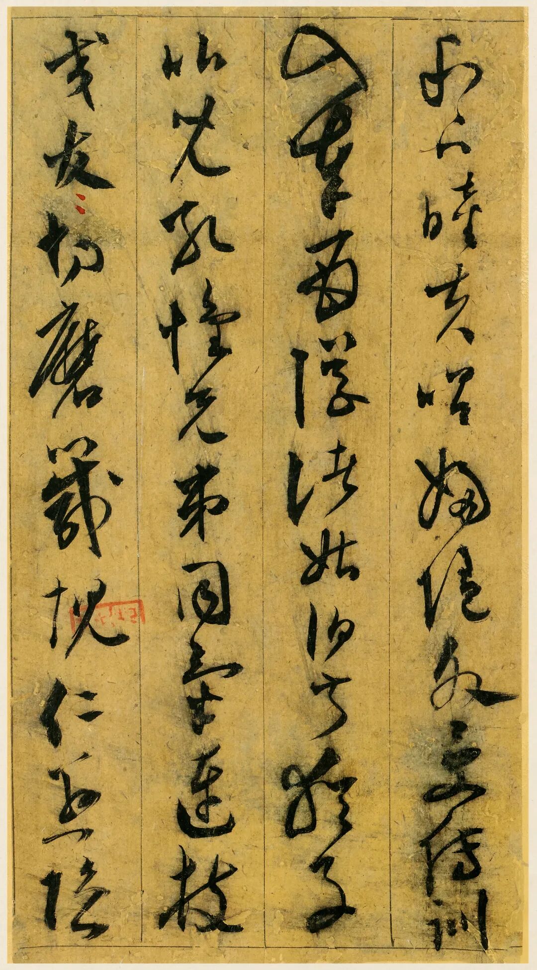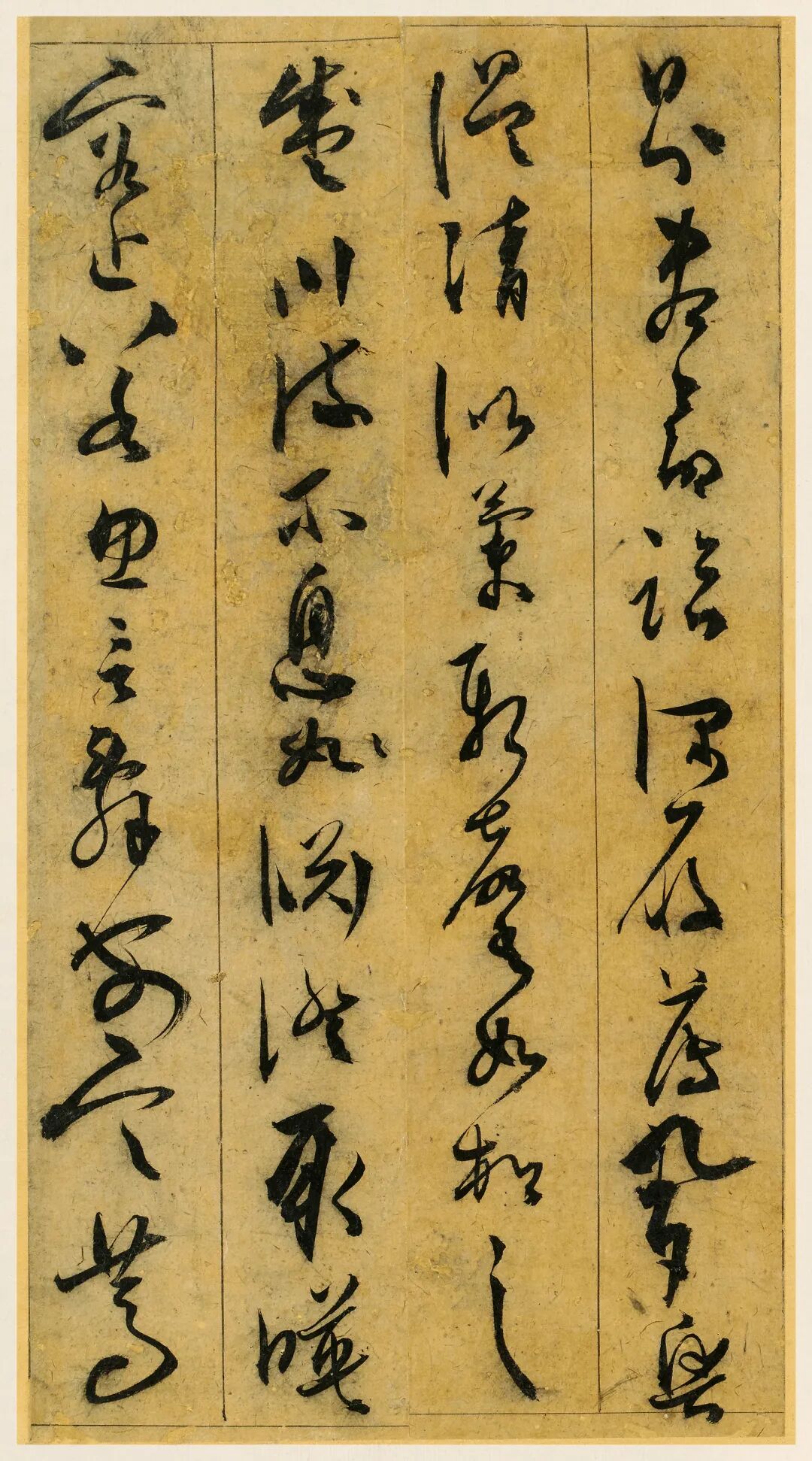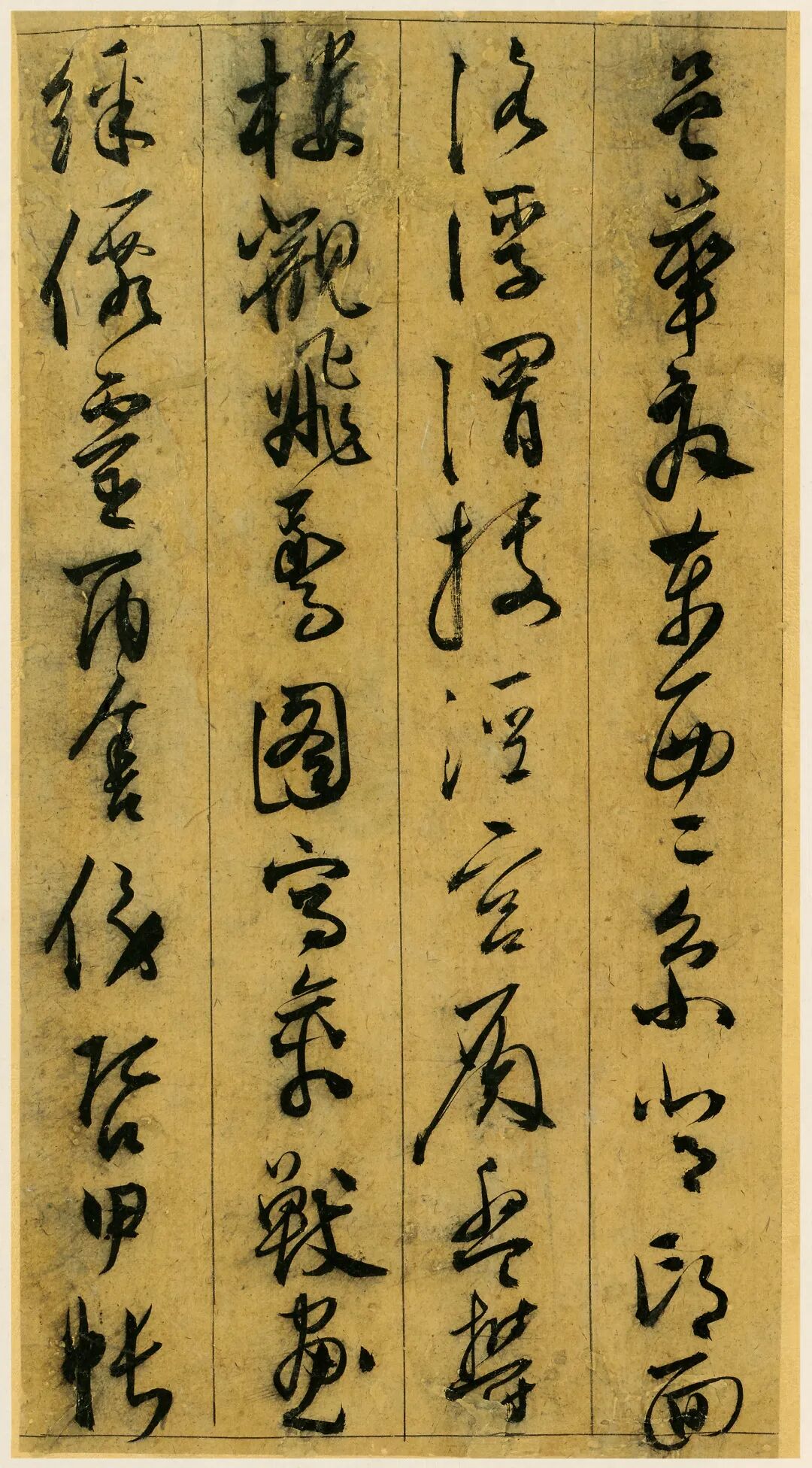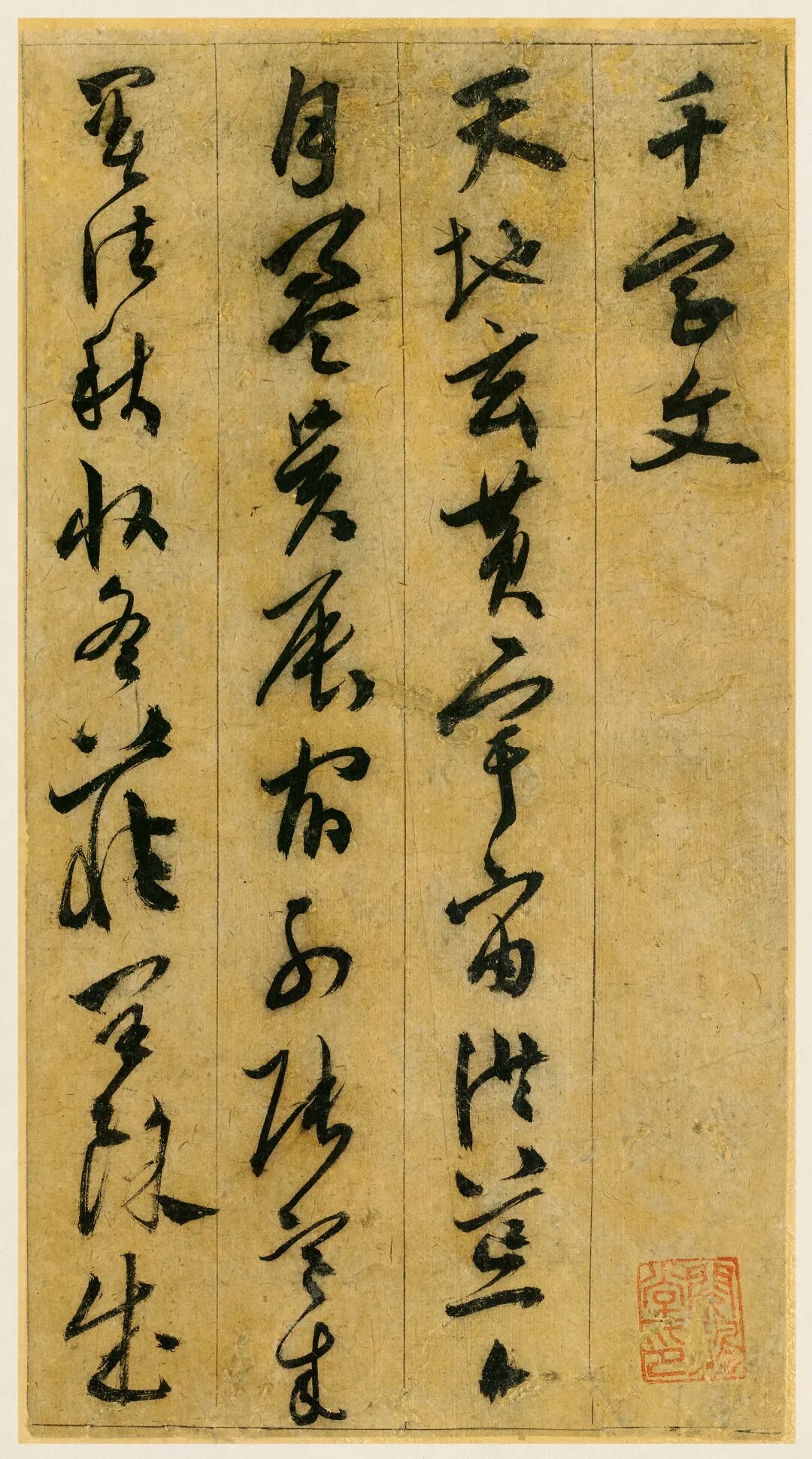 除了笔法与用墨外,纸张也是此册值得留意的看点。近墨堂本陈淳《草书千字文》为金粟山藏经纸本,纸为北宋治平年间(1064-1067)宋人印《大藏经》时特制,其上有,明代中期被发现并散出。此纸坚韧紧密,常被揭成两片,背面可用于书写、作画,书写感极佳,甚名贵。陈淳极为钟爱,他不但经常用它作书,也用其作画。光滑的纸面使其行草更为流利,而墨色滋润有神采。此册纸墨精良,实为陈淳晚年佳品。