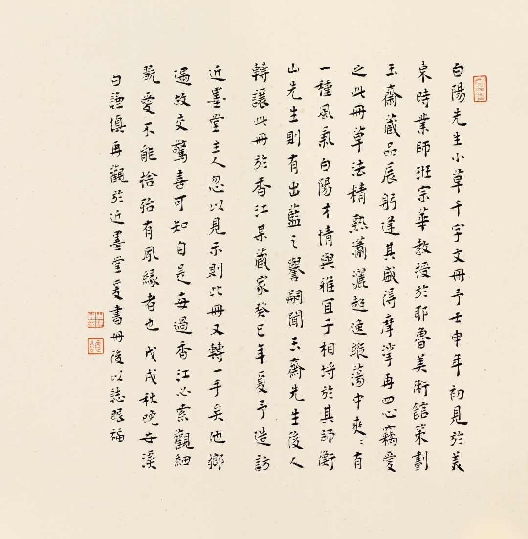册中另有一开为近代鉴藏家叶恭绰(1881-1968)跋,作于1927年。跋中写道:“白阳以画名,但其书法出入苏、米之间,足与文、祝抗衡,似远在百毂(王穉登)、云卿(莫是龙)诸公之上。此册纵横洞达,意力俱到,足称合作。”赞誉极高。其后附有白谦慎题跋。