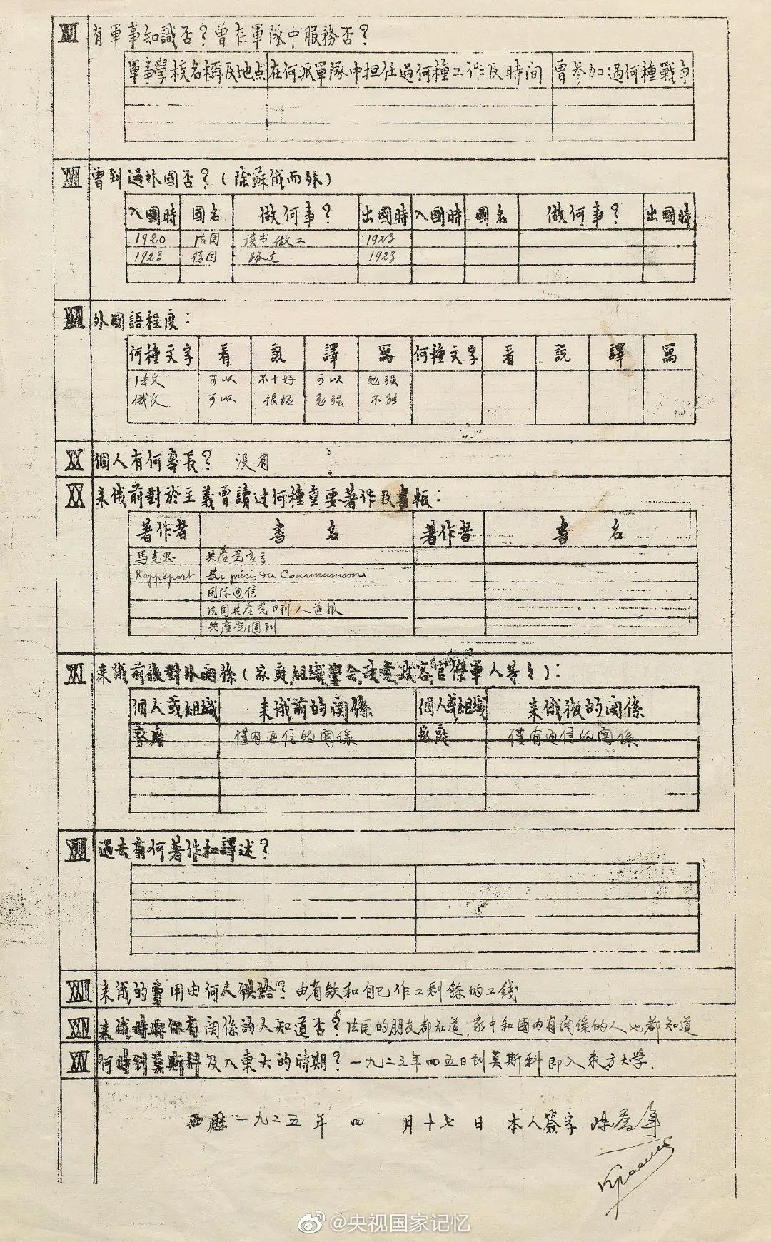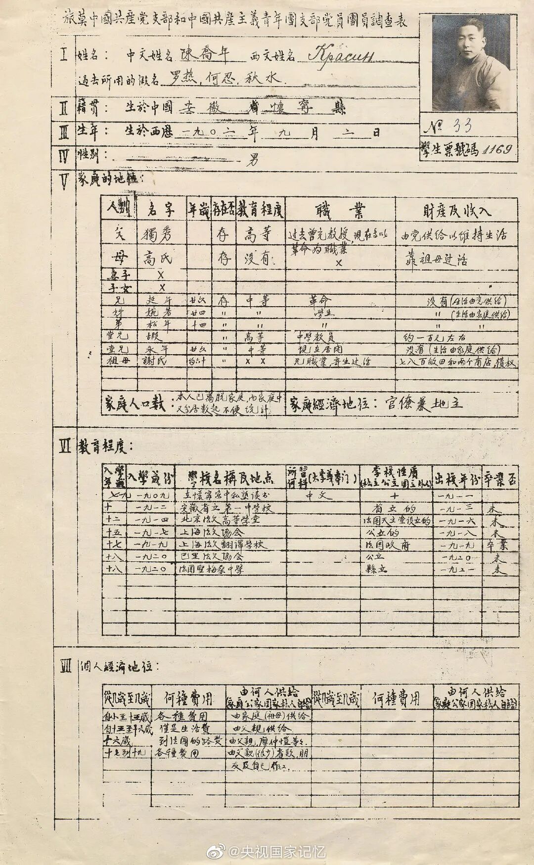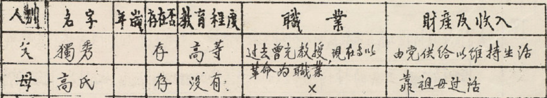 陈独秀之子陈乔年的履历表首度公开
