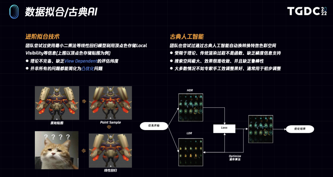 右图是我们和数据团队通过一些古典人工智能,比如遗传算法的手段去用LDR特效拟合HDR效果的例子。但这些方法搜索空间太大,收敛缓慢,而且效果上也不如人意,大多数情况不如专家手工效调整果好、通常用于初步调整。