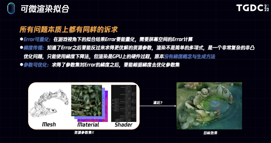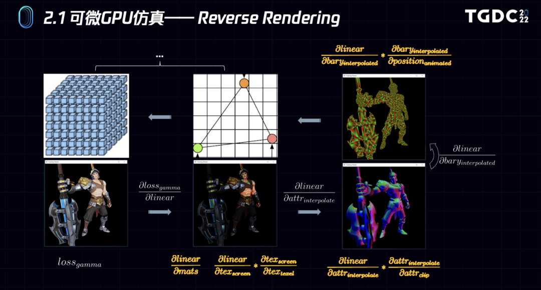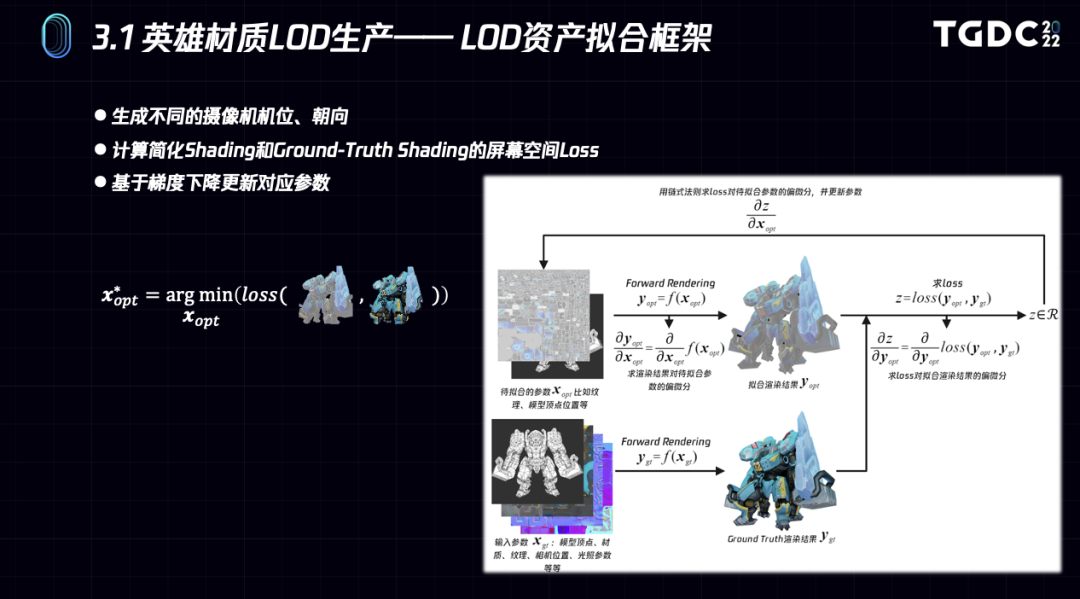 有了可微渲染之后,上面诸多问题的统一解决方法其实就是,首先渲染高质量画面A,然后渲染Lod画面B,在屏幕空间求得两者的画面差异Loss,然后对待拟合参数求梯度,用梯度下降算法求解参数的一个最优解。Loss函数其实有各种各样的。待拟合参数包括模型、材质参数、贴图,甚至shader函数等。