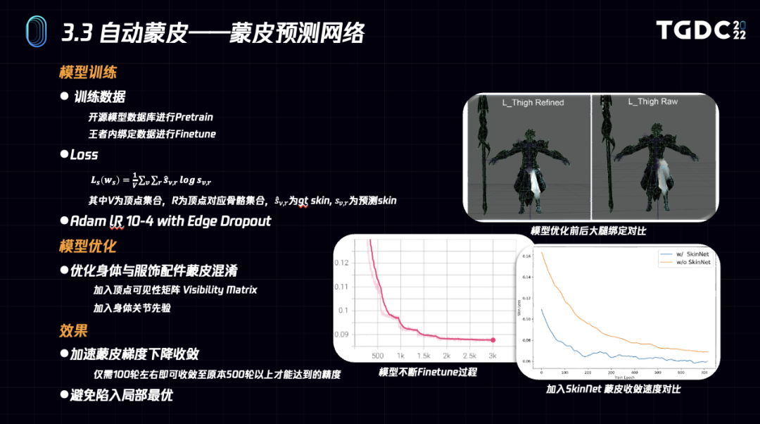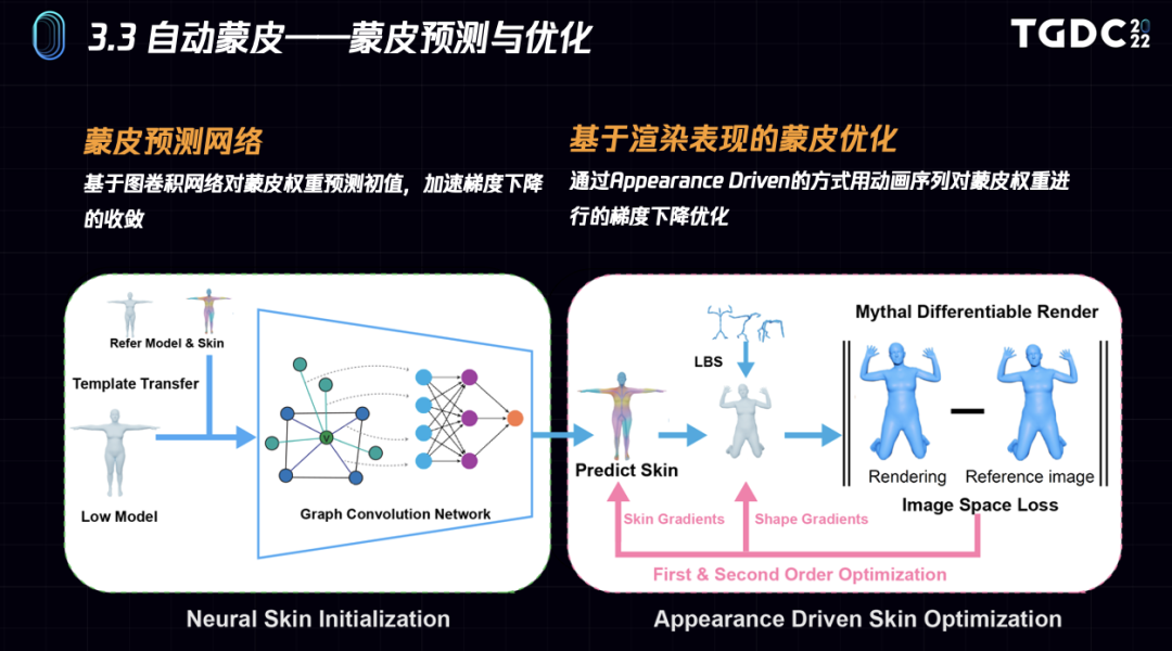 蒙皮预测神经网络会基于图卷积网络预测蒙皮权重初值,加速后续梯度收敛。基于渲染表现的蒙皮优化则通过Appearance Driven的方式用动画序列对蒙皮权重进行梯度下降优化。